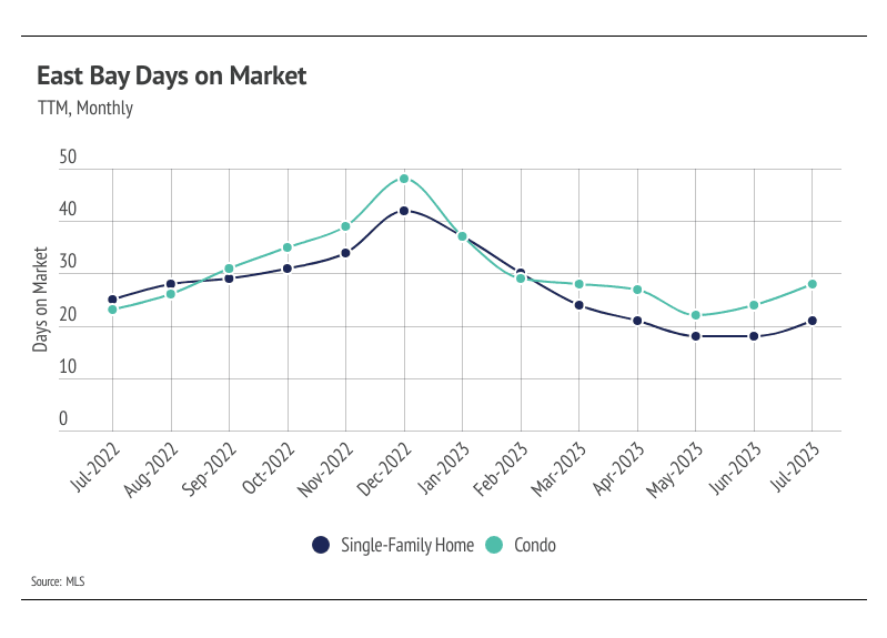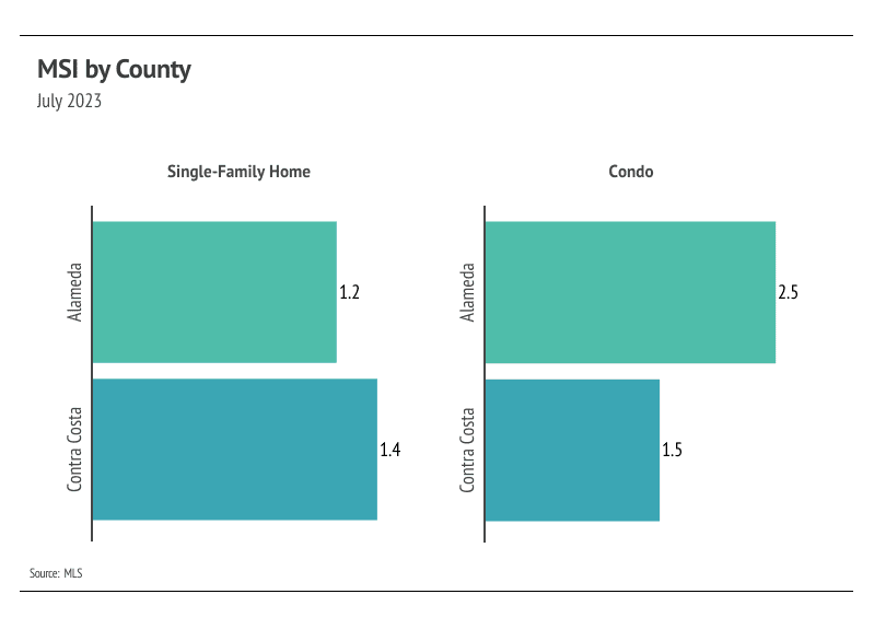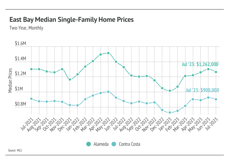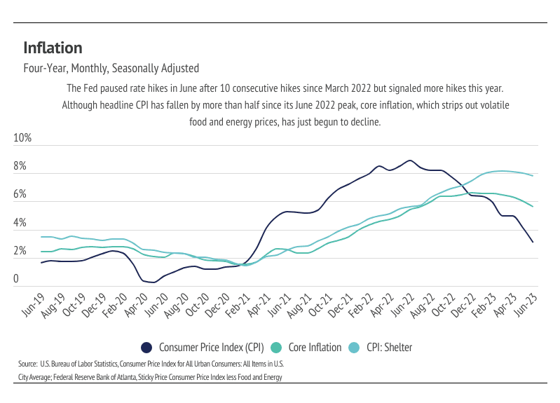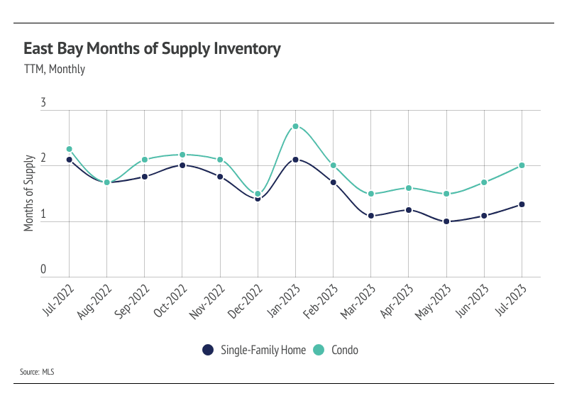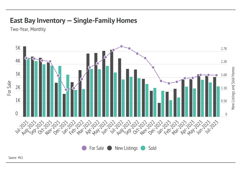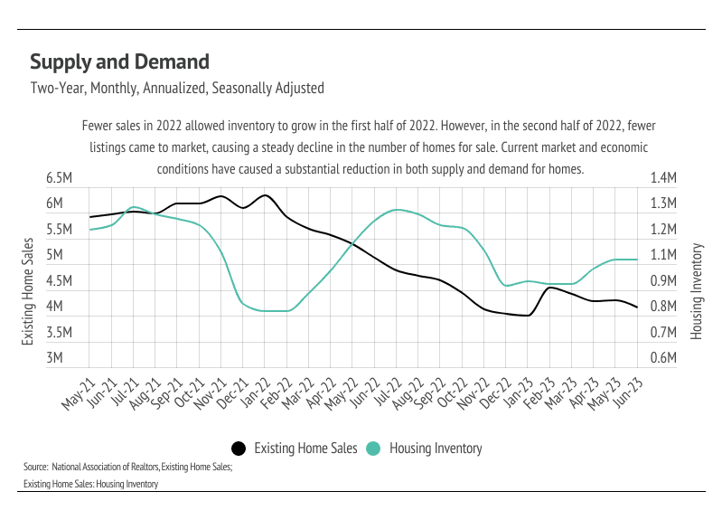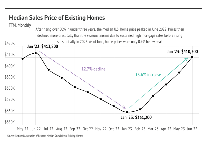 At the start of 2023, the economic consensus resoundingly predicted an impending recession, which has yet to come, and we’re happy to say that consensus has shifted to moderate economic growth. A “soft landing” — reducing inflation without a recession — seems more likely than ever. The economy is far from perfect, but the effect of largely positive economic news eventually leads to a more positive economic outlook from the average person. Job creation and GDP growth in the first half of 2023 have significantly beat expectations. Inflation is declining rapidly, and consumer confidence is the highest it’s been since February 2022. We can largely attribute the bounce in home prices to consumer perception, but consumer perception isn’t the only factor. Home prices certainly rose as recession worries subsided, even in the face of elevated mortgage rates. Supply, or lack thereof, has been the other major factor in the price rebound. Low, but growing inventory allowed for prices to increase quickly.