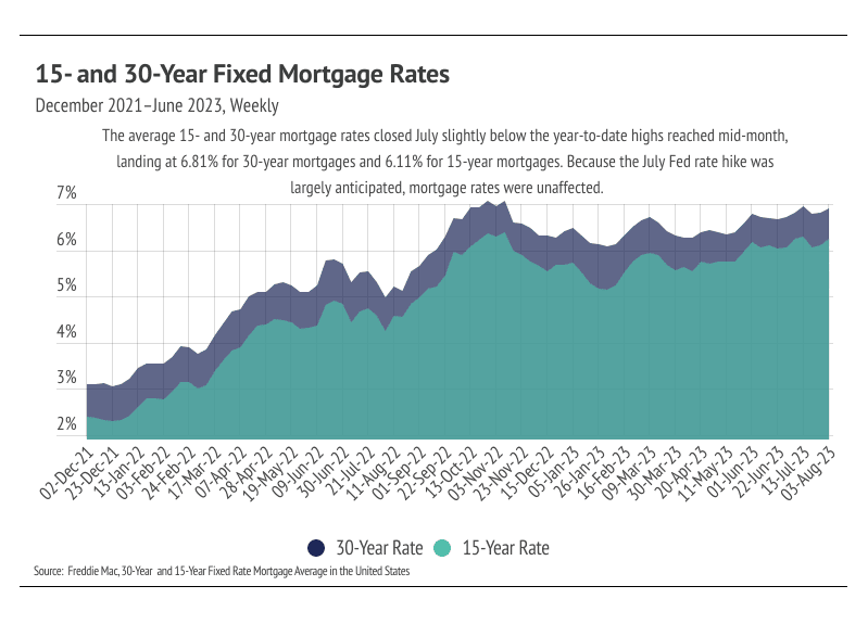 • The Fed hiked rates by 0.25% in mid-July to the highest level since 2001, which didn’t impact mortgage rates because the rate increase was expected. However, Fitch unexpectedly downgraded U.S. credit from AAA to AA+ on August 1 and, although we’ve maintained that 30-year mortgage rates would likely hover between 6% and 7% during 2023, the surprise downgrade may push mortgage rates slightly above 7% in the third quarter.