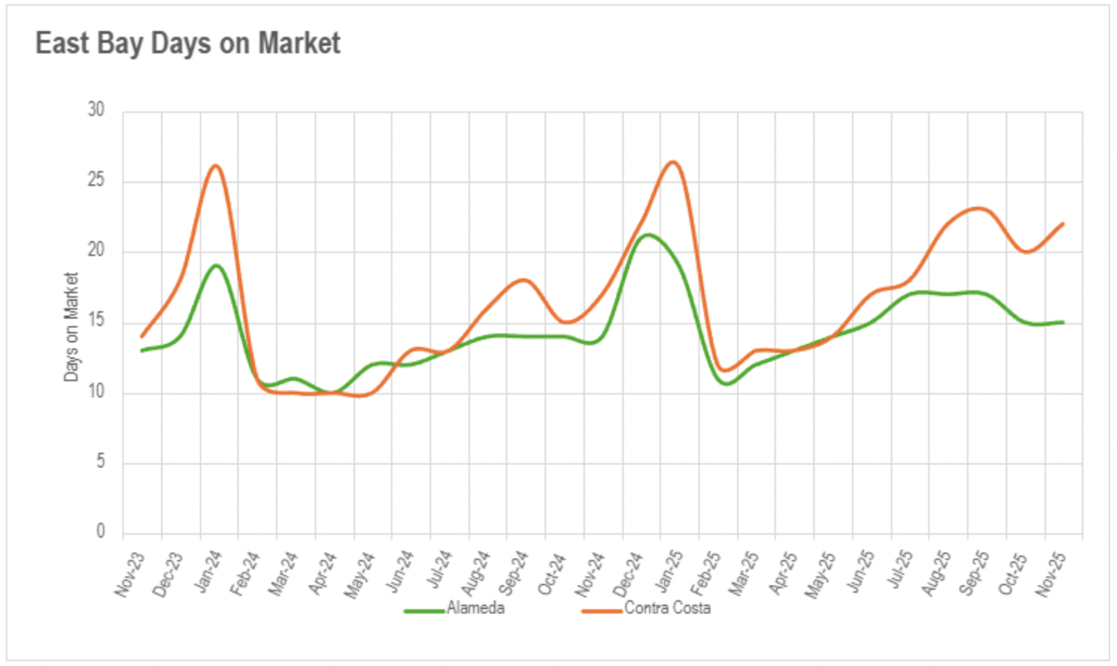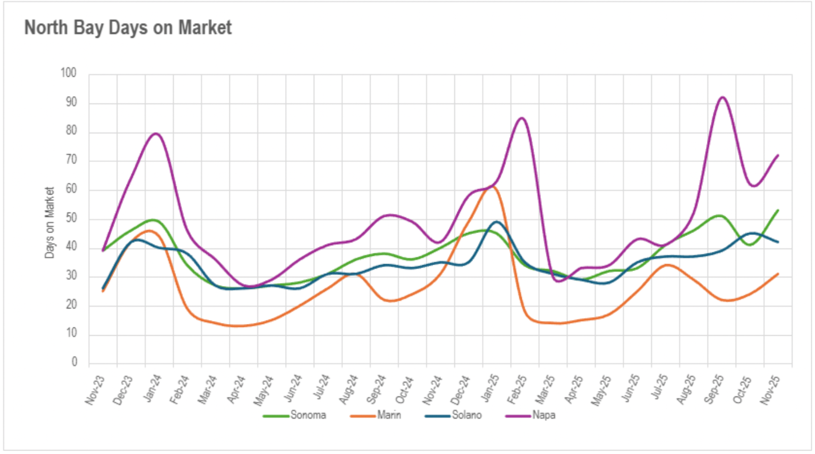 North Bay regions displayed considerable annual increases in most counties, with single-family properties requiring 32.50%, 20%, and 71.46% longer on market in Sonoma, Solano, and Napa Counties respectively, though Marin County remained perfectly unchanged at 31 days in both November 2024 and 2025. Compellingly, Marin condominiums actually accelerated with a 26.83% annual reduction in market duration, while the typical Napa County condominium required nearly half a year (approximately 180 days) on market. East Bay markets perpetuated their year-long configuration of percentage increases obscuring relatively expeditious absolute durations for single-family properties, while condominiums faced more considerable slowdowns with 39.29% and 20.00% increases in Alameda and Contra Costa Counties respectively.