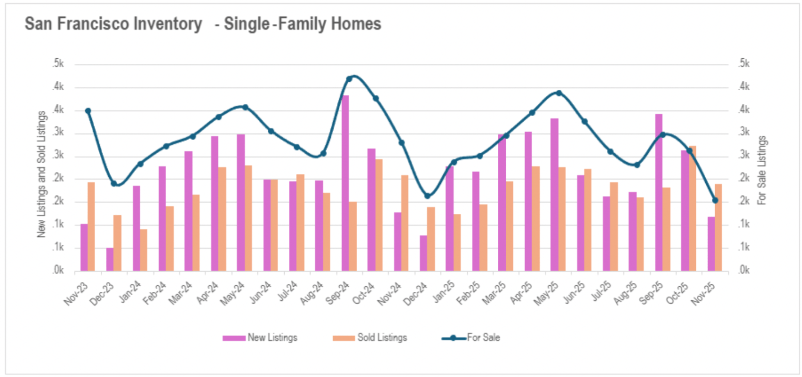 November constituted an exceptional availability contraction throughout the Bay Area, with most regions recording pronounced monthly declines as the market transitioned into its seasonal winter deceleration. San Francisco commanded with the most acute compression, as total availability reached merely 553 properties for transaction - the minimal level in three years. Single-family availability crashed 44.84% annually while condominiums declined 41.90%, establishing unprecedented supply limitations. Silicon Valley's single-family sector experienced a substantial "overcompensation," with availability plunging nearly 30% monthly and 10% annually, nearing the extreme minimums last documented in December 2024. The condominium sector demonstrated greater steadiness with availability essentially unchanged at just 1.11% above last year.