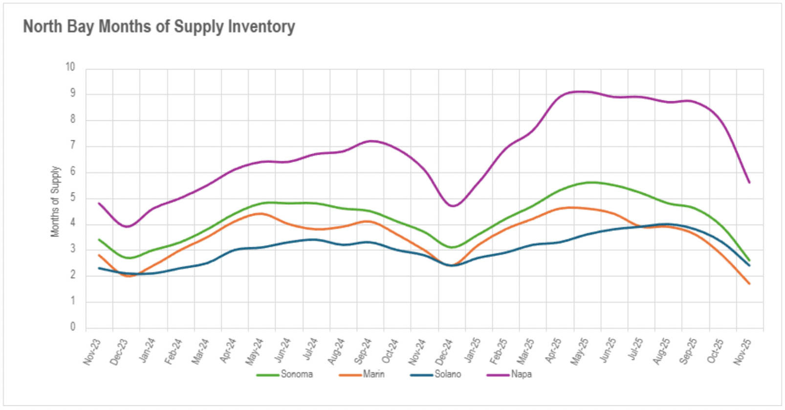 East Bay markets preserved their conventional market architecture but with intensifying seller positioning, as single-family properties achieved exceptionally constrained 1.4 months in Alameda and 1.8 months in Contra Costa, while condominiums remained in buyer territory at 3.6 and 3.1 months respectively. North Bay regions demonstrated distinct seasonal progression toward seller-favorable markets throughout all property categories, with single-family properties in Marin establishing robust seller-favorable market status at 1.7 months, Sonoma and Solano at 2.6 and 2.4 months respectively (seller-favorable markets), and even Napa progressing toward equilibrium at 5.6 months. North Bay condominiums exhibited comparable progression with Marin at 3.0 months (balanced), Sonoma at 3.2 months (nearing balanced), and Solano and Napa at 4.4 and 5.1 months respectively (buyer-favorable markets progressing toward equilibrium). This regionwide configuration indicates the Bay Area has commenced a period of extreme supply limitation that will likely strengthen through December's characteristically minimal-availability holiday season.