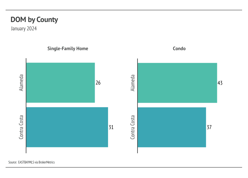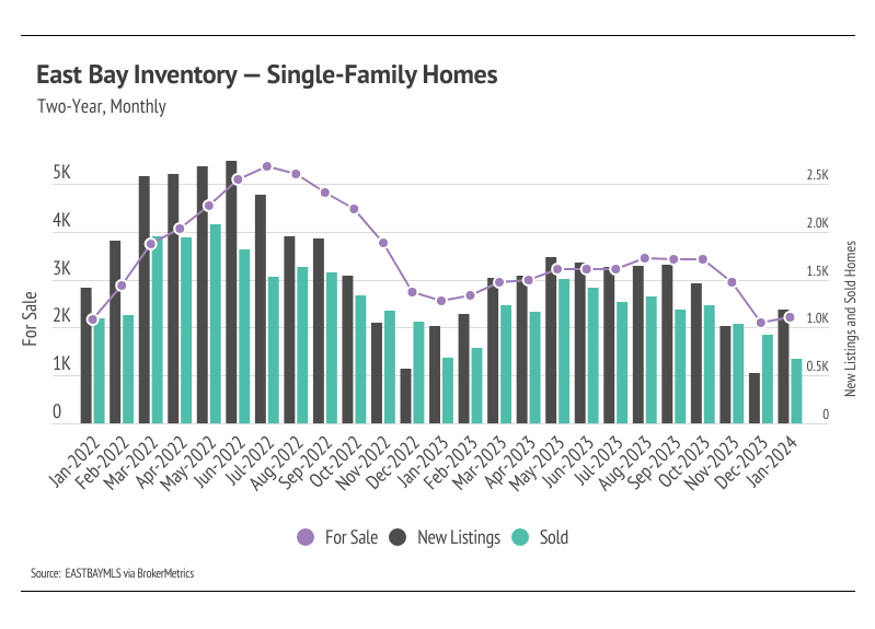 Months of Supply Inventory (MSI) quantifies the supply/demand relationship by measuring how many months it would take for all current homes listed on the market to sell at the current rate of sales. The long-term average MSI is around three months in California, which indicates a balanced market. An MSI lower than three indicates that there are more buyers than sellers on the market (meaning it’s a sellers’ market), while a higher MSI indicates there are more sellers than buyers (meaning it’s a buyers’ market). The East Bay market tends to favor sellers, which is reflected in its low MSI. MSI fell sharply in the first quarter of 2023 before gently trending higher from May to November. In December, MSI declined sharply, but rose again in January. Currently, the East Bay market favors sellers for single-family homes and is more balanced for condos.
