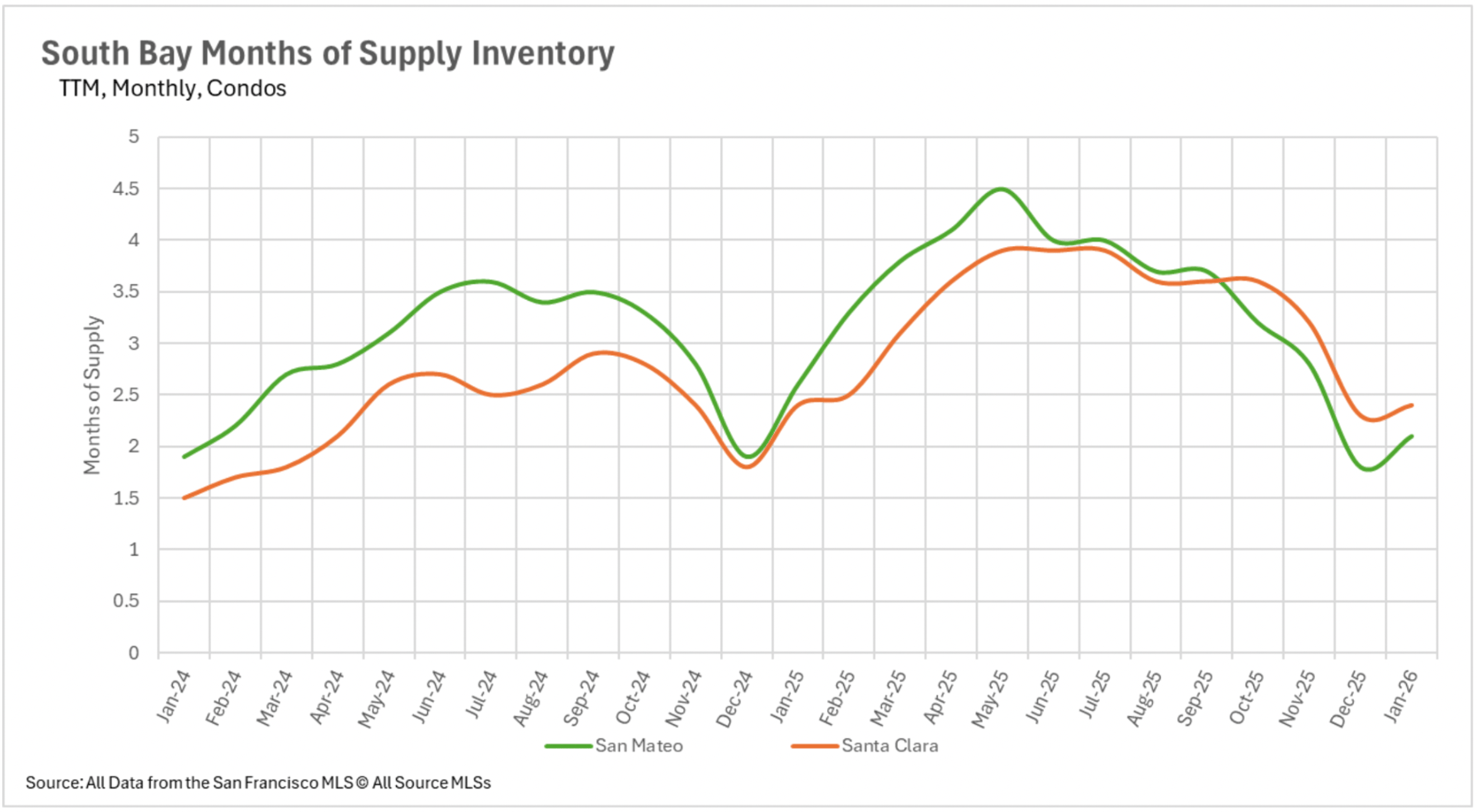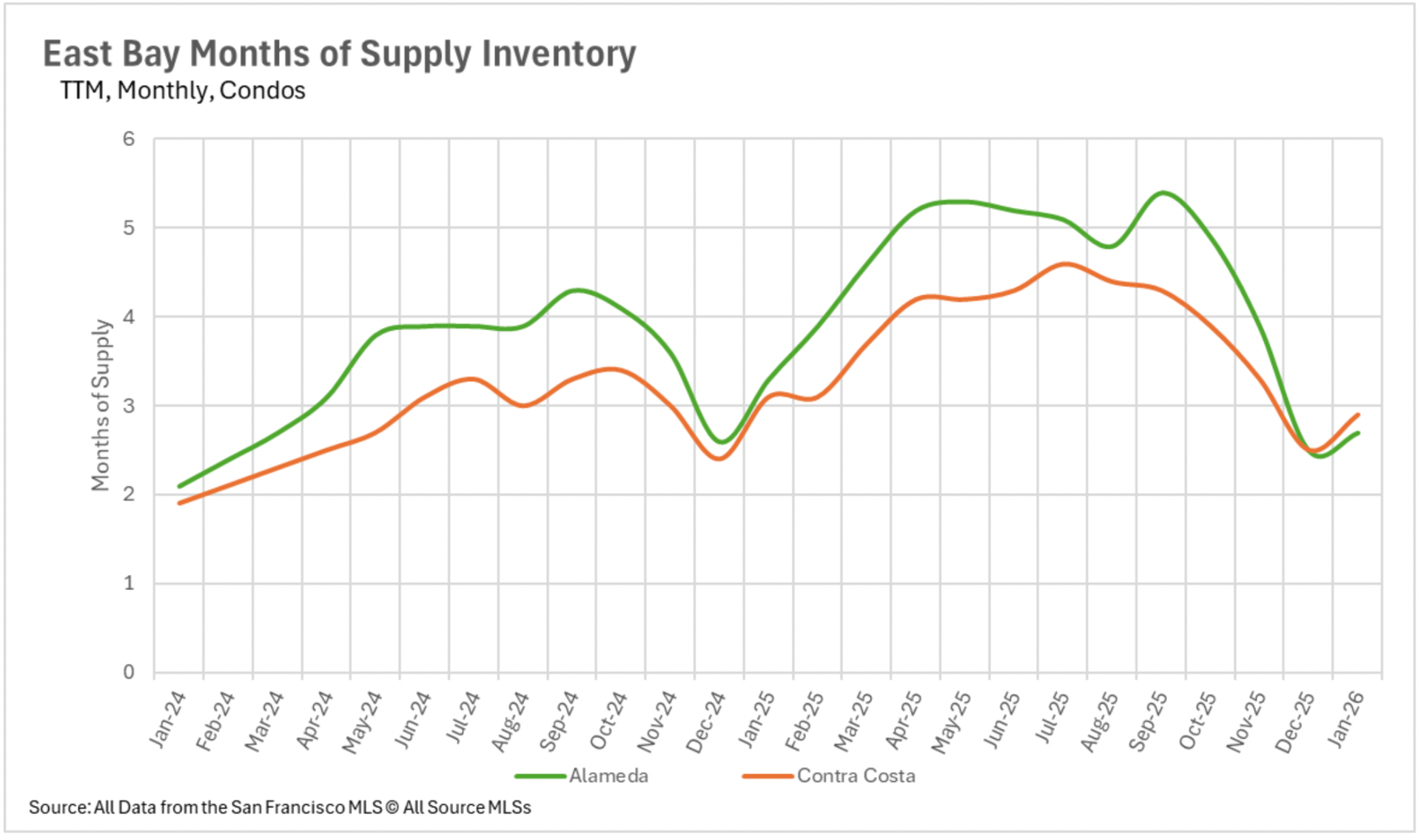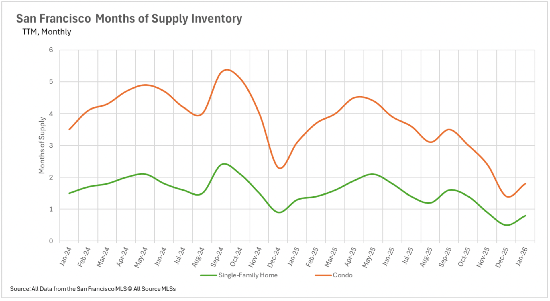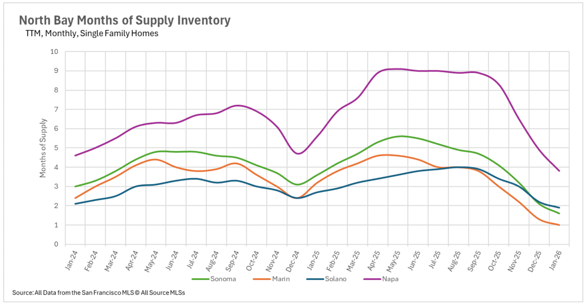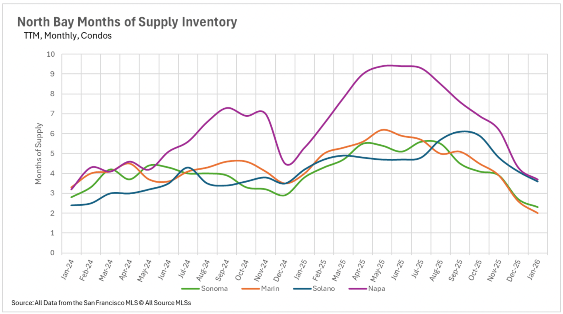 January established seller-favorable market conditions across nearly every segment of the Bay Area's single-family property market. San Francisco and Santa Clara County are registering merely 0.8 and 0.9 months of supply, respectively, while Marin County maintains just 1 month of supply, declining an exceptional 68.75% annually. Alameda County maintains 1.1 months, Contra Costa County maintains 1.5 months, and Sonoma County maintains 1.6 months. Even Napa County, which sustained robust buyer-favorable conditions throughout substantial portions of 2025, has contracted to 3.8 months. The condominium sector has also compressed considerably, though several pockets maintain buyer-favorable territory, including Santa Cruz County at 3.3 months, Solano County at 3.6 months, and Napa County at 3.7 months. With availability at historically minimal levels and the active spring transaction season approaching, sellers maintain an excellent position heading into the forthcoming months.
