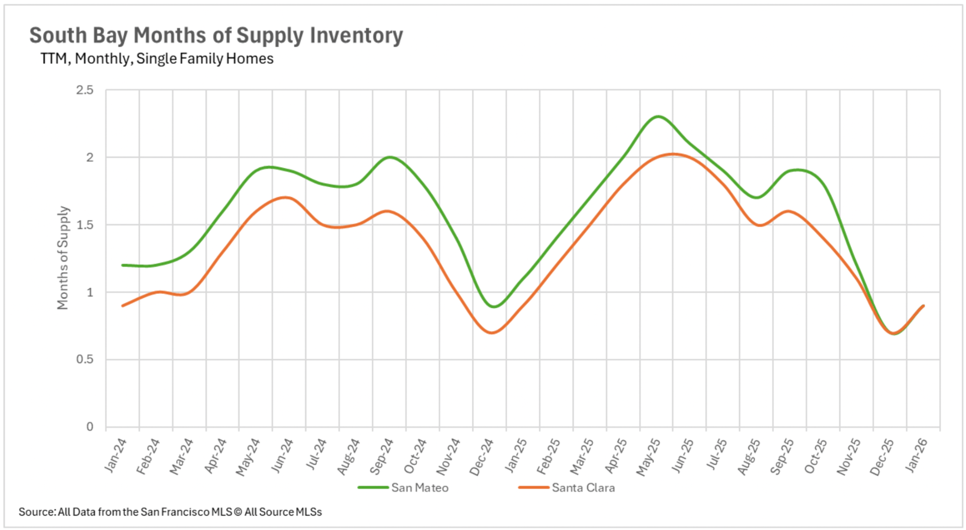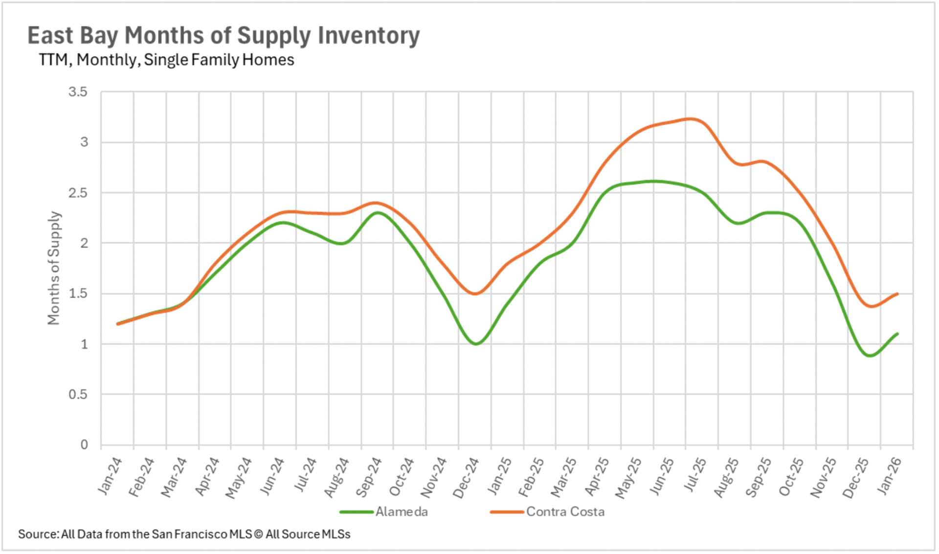 Nearly every single-family property market in the Bay Area maintains decisively seller-favorable territory, with several counties registering at or beneath one month of supply.