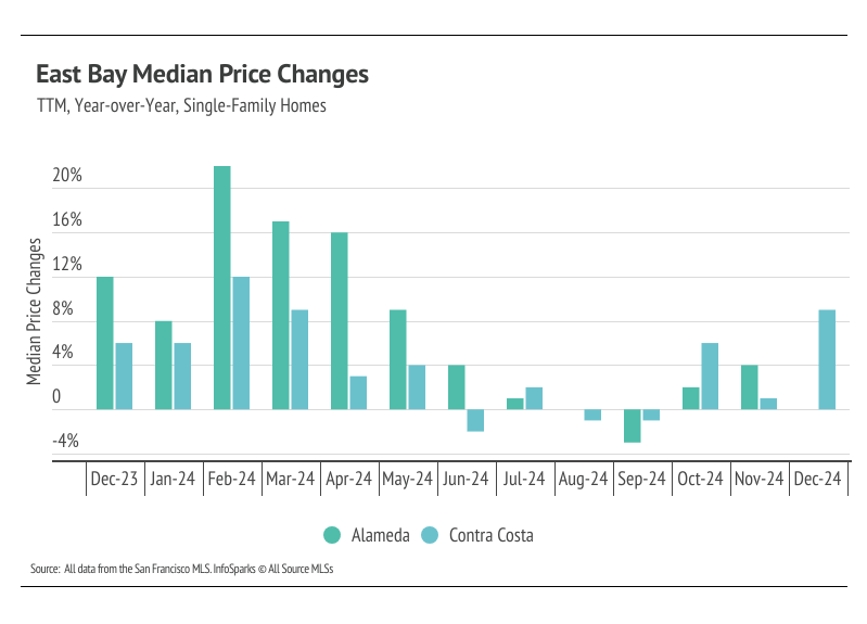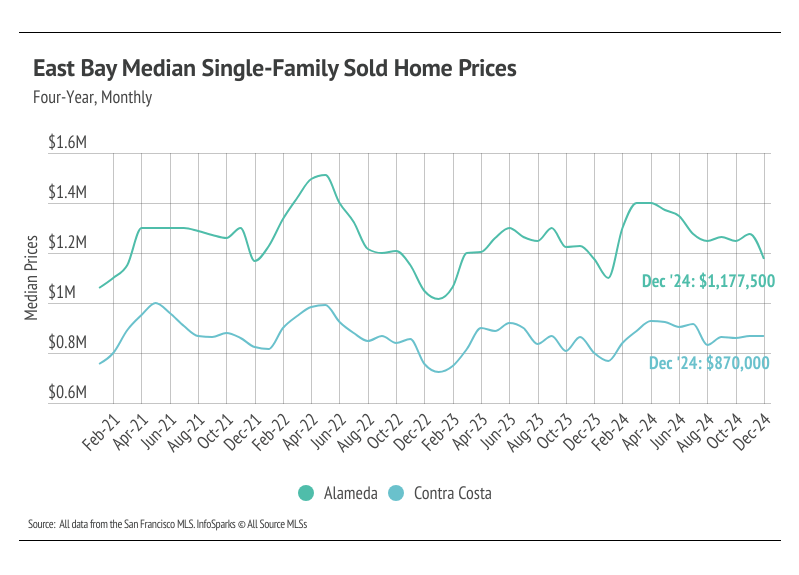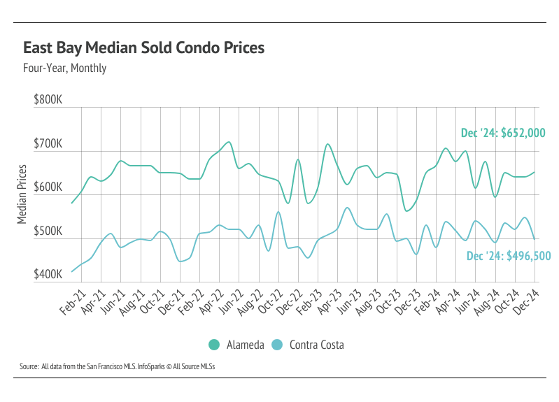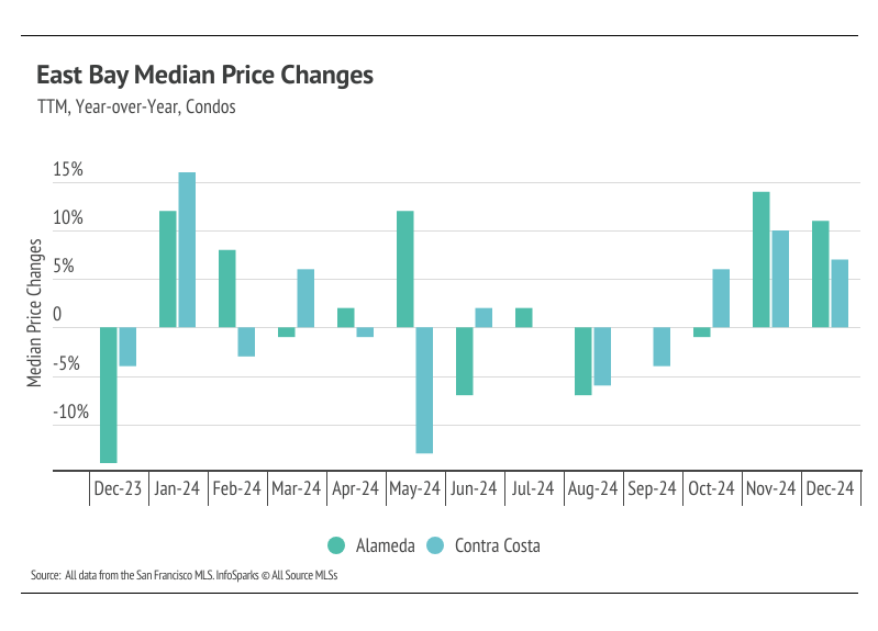 Median home prices rose in 2024, following historical seasonal trends. Single-family home prices in Contra Costa and condos in Alameda experienced the largest gains.