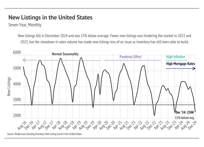 High mortgage rates soften both supply and demand, but homebuyers and sellers seemed to tolerate rates near 6% much more than around 7%. Mortgage rates fell significantly from May through September, but rose significantly in the fourth quarter of 2024. Now, rates are far closer to 7% than 6%, so we expect sales to slow further.