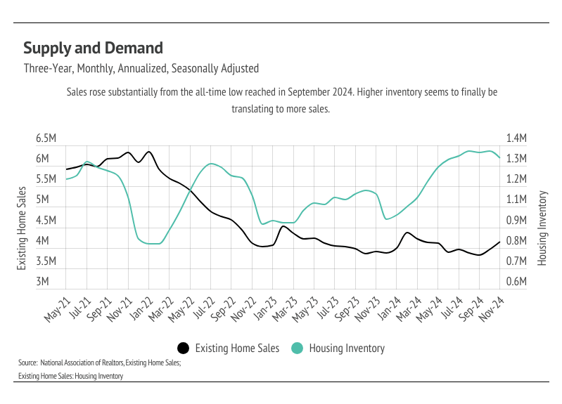 Despite economic policy uncertainty and increasing mortgage rates, home sales have increased substantially over the past two months. We attribute this rise to two main factors: much more inventory and the market’s acceptance of higher mortgage rates. Higher inventory has allowed potential buyers to more easily find the home that’s right for them with less competition, creating a better all-around buying experience. Additionally, buyers and sellers have broadly accepted that rates will be higher than they might like for some time, and waiting for rate drops isn’t worth the time anymore. There is also a potential third factor around economic sentiment; roughly half the country thinks more highly of the economy due to the incoming administration. For better or worse, vibes are important, and buying a home is often as much or more of an emotional choice as it is a financial one.