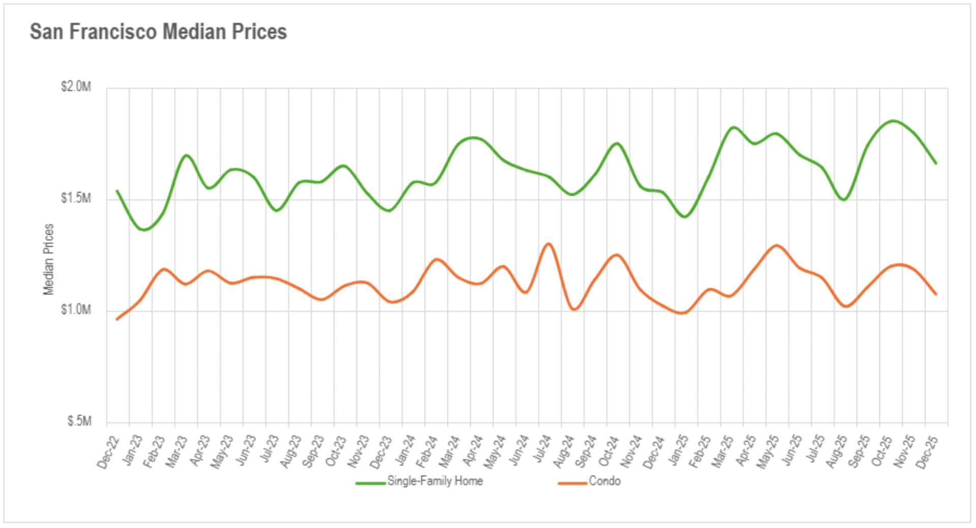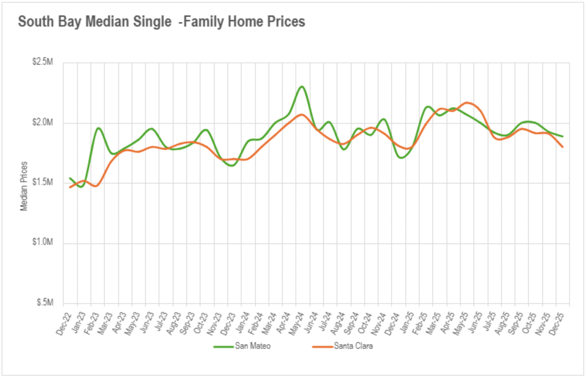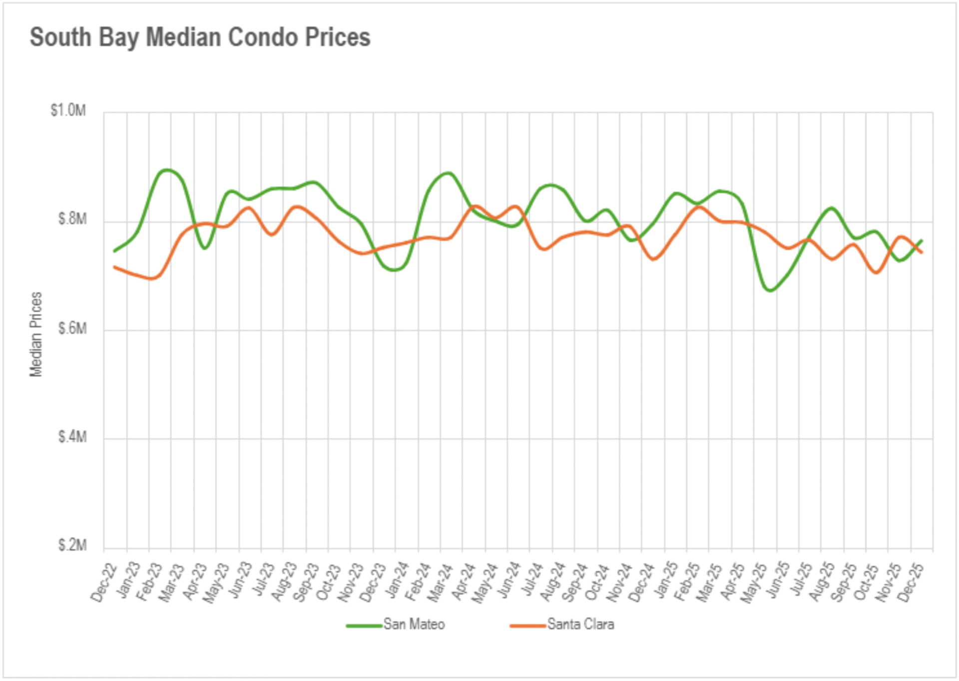 December delivered inconsistent value performance throughout the Bay Area, with San Francisco commanding appreciation while other regions exhibited varying outcomes. San Francisco concluded 2025 on a robust trajectory with single-family properties gaining 8.63% annually to achieve a median of $1,662,000, while condominiums climbed 5.21% to $1,075,000. Single-family properties continue securing substantial premiums, transacting for nearly 13% over asking value. Silicon Valley recorded a December recovery following November's uncommon comprehensive retreats, with San Mateo County commanding at 9.74% annual gains to $1,887,500, while Santa Clara County witnessed a moderate 0.55% decline to $1,800,000 and Santa Cruz remained relatively steady with a 0.79% advance to $1,270,000. Silicon Valley condominiums displayed fluctuation, with San Mateo declining 3.84%, Santa Clara advancing 1.71%, and Santa Cruz surging 10.48%.