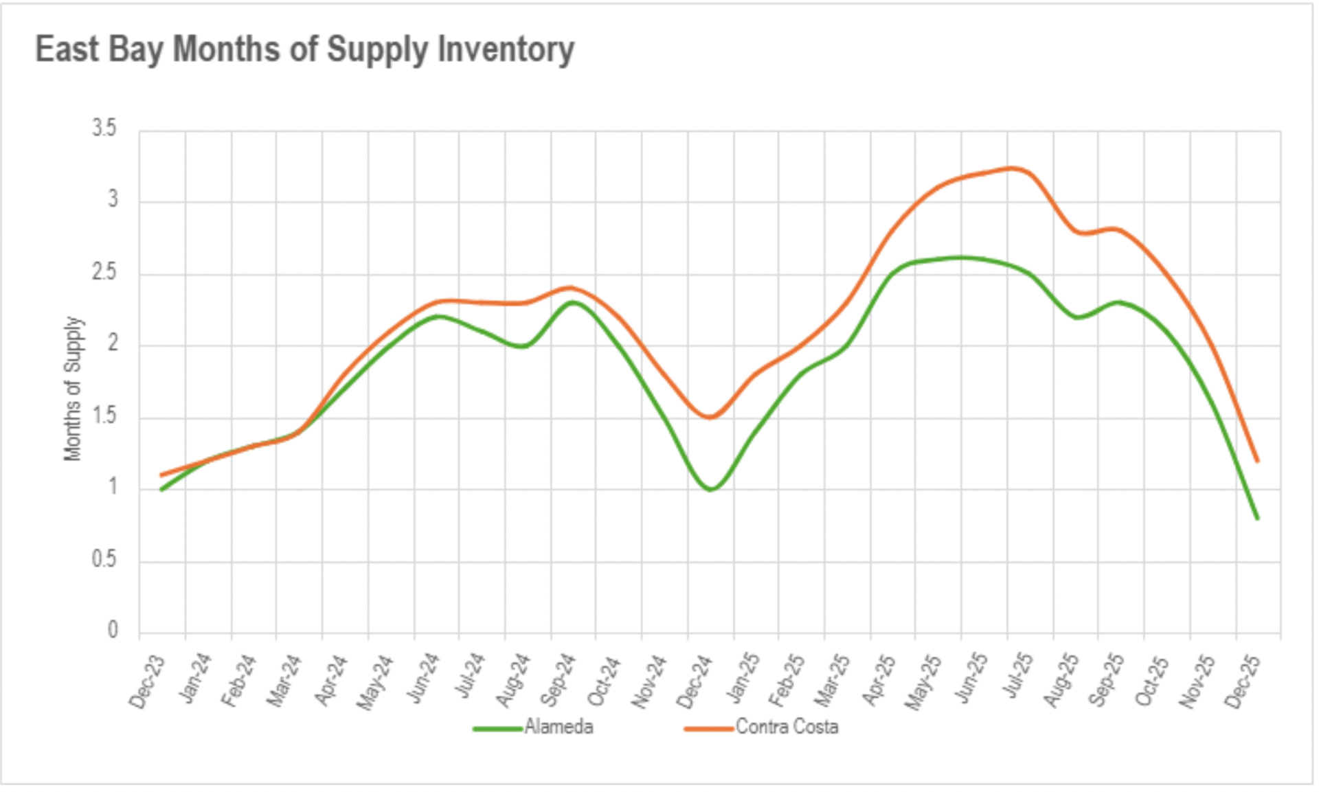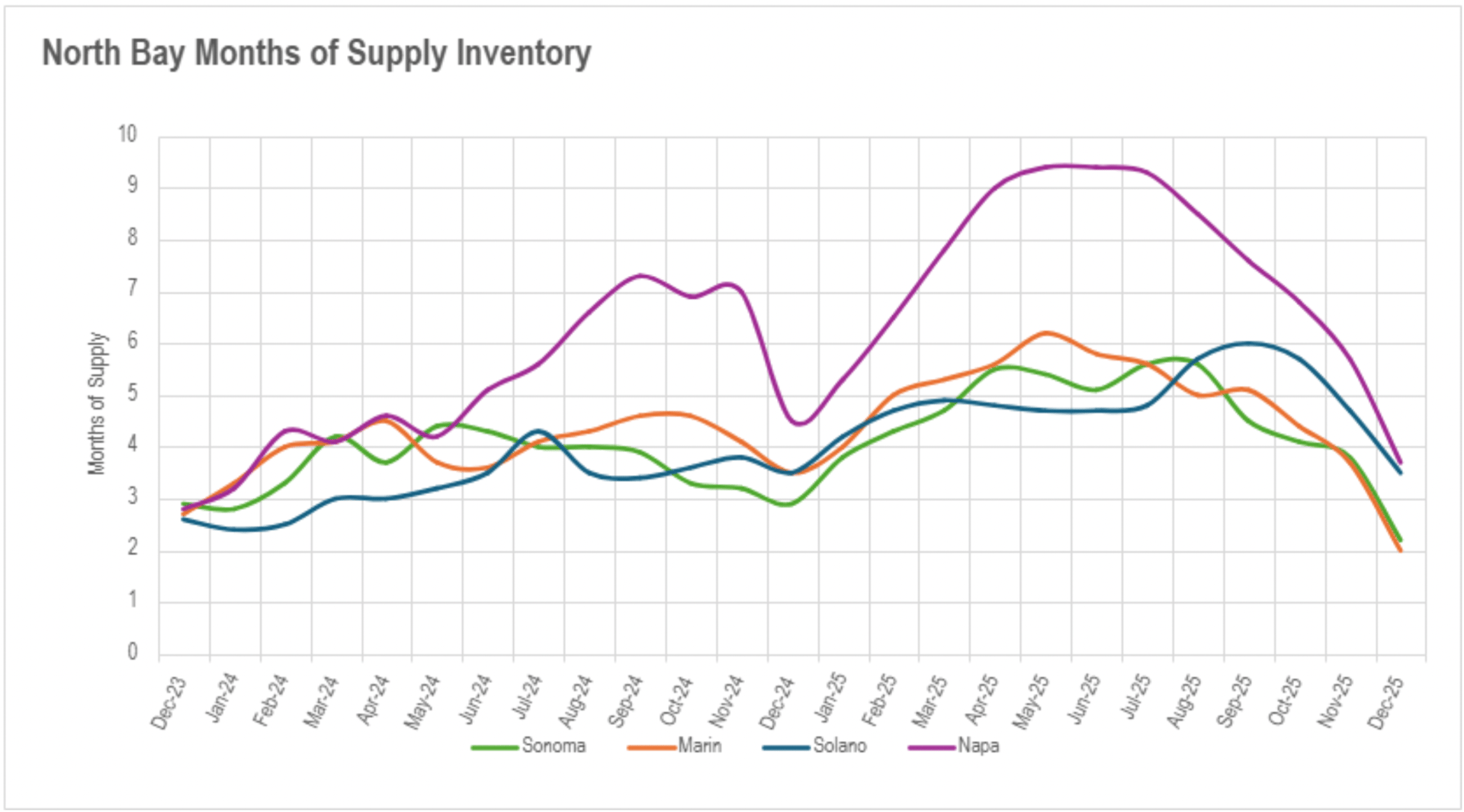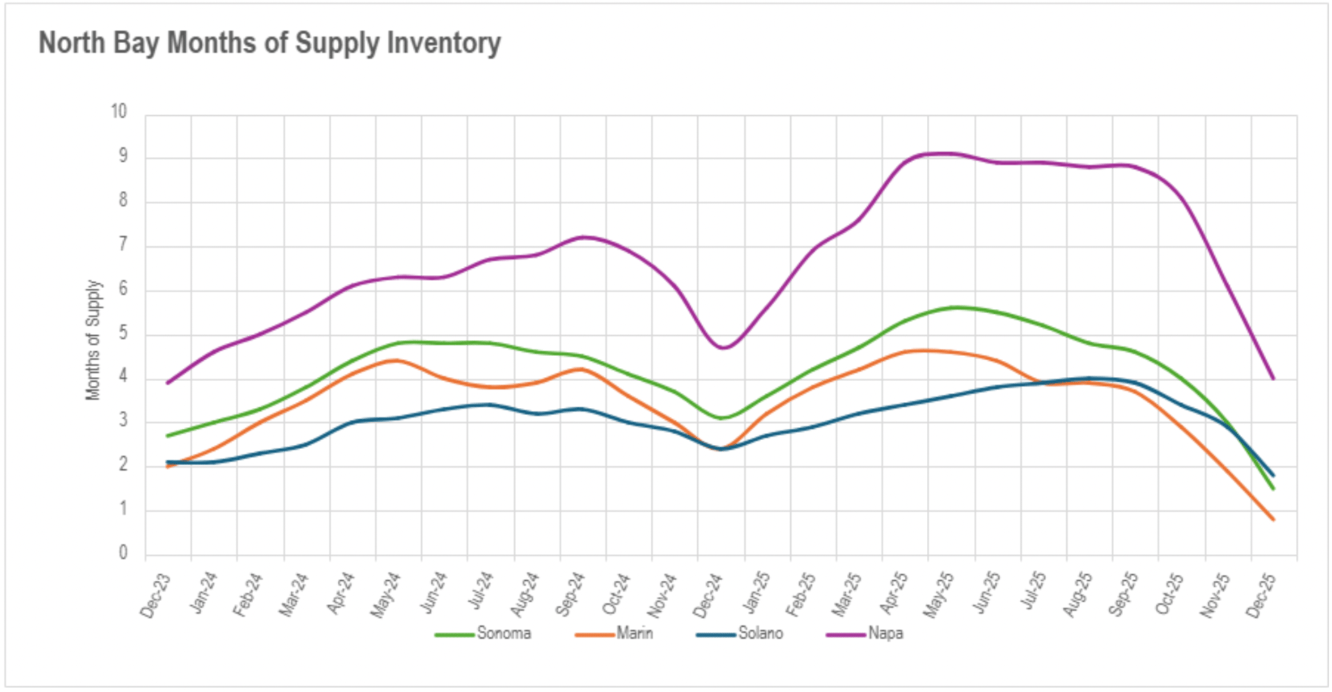 East Bay markets concluded the year with exceptionally constrained circumstances, registering merely 0.8 months of single-family availability in Alameda County and 1.2 months in Contra Costa (both declining 20% annually), while even condominiums transitioned into seller territory at 2.2 and 2.4 months respectively. North Bay regions experienced a substantial holiday period transformation, with Marin County commanding at an extreme 0.8 months of single-family supply (declining 66.67% annually), Sonoma at 1.5 months, Solano at 1.8 months, and even Napa - which had maintained buyer-favorable conditions throughout 2025 - contracting to 4.0 months. North Bay condominiums also compressed considerably with Marin at 2.0 months, Sonoma at 2.2 months, and Solano and Napa at 3.5 and 3.7 months respectively. This regionwide transformation into seller-favorable market territory, combined with historically minimal new listing engagement, indicates intense competition will perpetuate into early 2026 until meaningful new availability enters the market.
