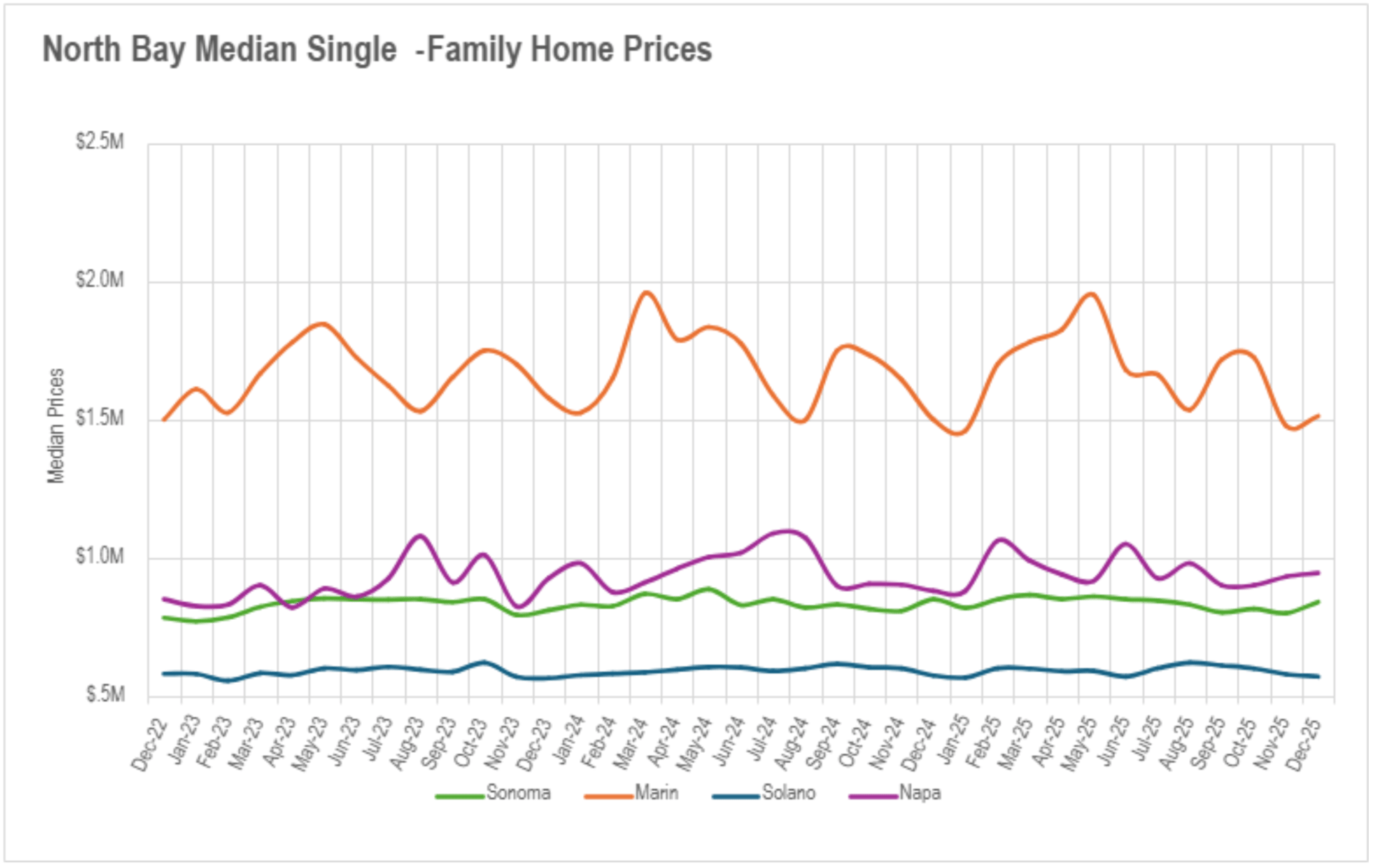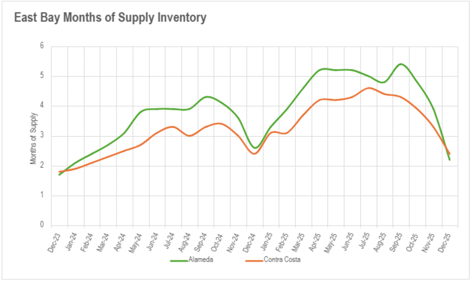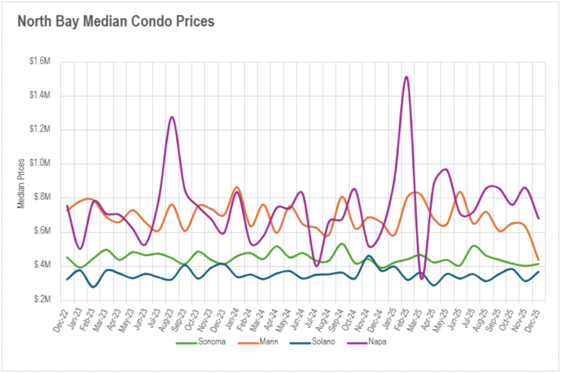 East Bay markets concluded the year with exceptionally constrained circumstances, registering merely 0.8 months of single-family availability in Alameda County and 1.2 months in Contra Costa (both declining 20% annually), while even condominiums transitioned into seller territory at 2.2 and 2.4 months respectively. North Bay regions experienced a substantial holiday period transformation, with Marin County commanding at an extreme 0.8 months of single-family supply (declining 66.67% annually), Sonoma at 1.5 months, Solano at 1.8 months, and even Napa - which had maintained buyer-favorable conditions throughout 2025 - contracting to 4.0 months. North Bay condominiums also compressed considerably with Marin at 2.0 months, Sonoma at 2.2 months, and Solano and Napa at 3.5 and 3.7 months respectively. This regionwide transformation into seller-favorable market territory, combined with historically minimal new listing engagement, indicates intense competition will perpetuate into early 2026 until meaningful new availability enters the market.