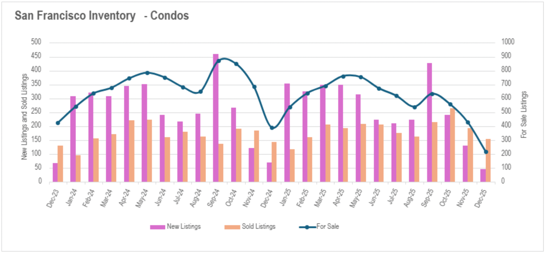 December produced an exceptional availability collapse throughout the entire Bay Area, establishing some of the most constrained supply circumstances documented in years. San Francisco achieved unprecedented levels with merely 93 single-family properties for transaction (declining 43.64% annually) and only 218 condominiums (declining 44.10%), producing a combined total of just 311 properties available in the entire municipality. Silicon Valley experienced similarly substantial compression, with single-family availability plunging 43.01% monthly and 21.02% annually to just 823 properties, while condominium availability declined 33.04% monthly though remained essentially unchanged annually.