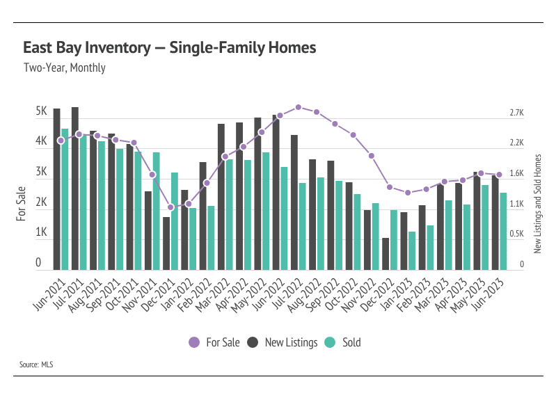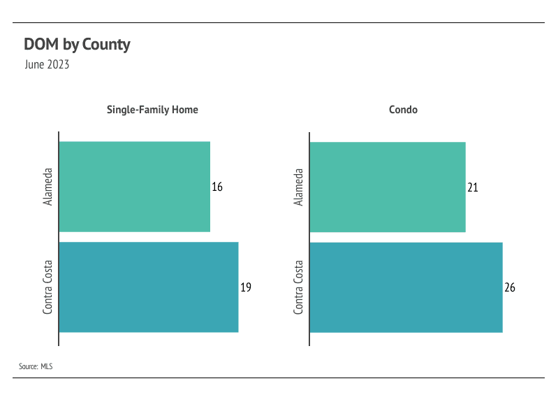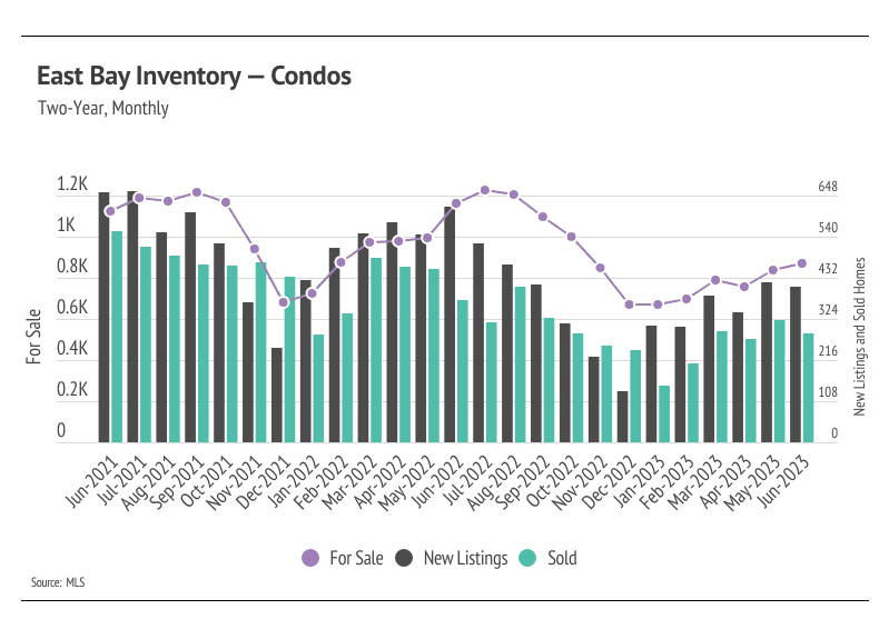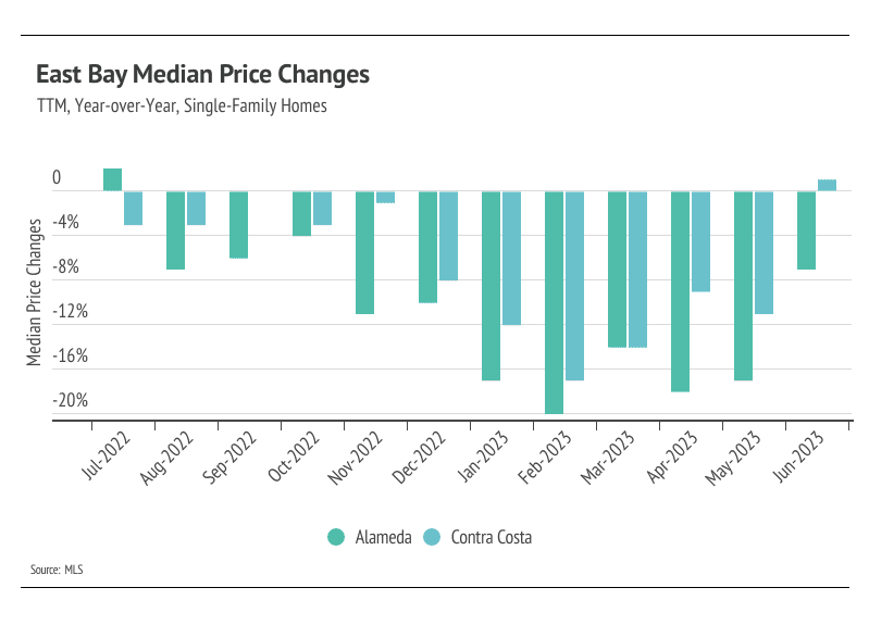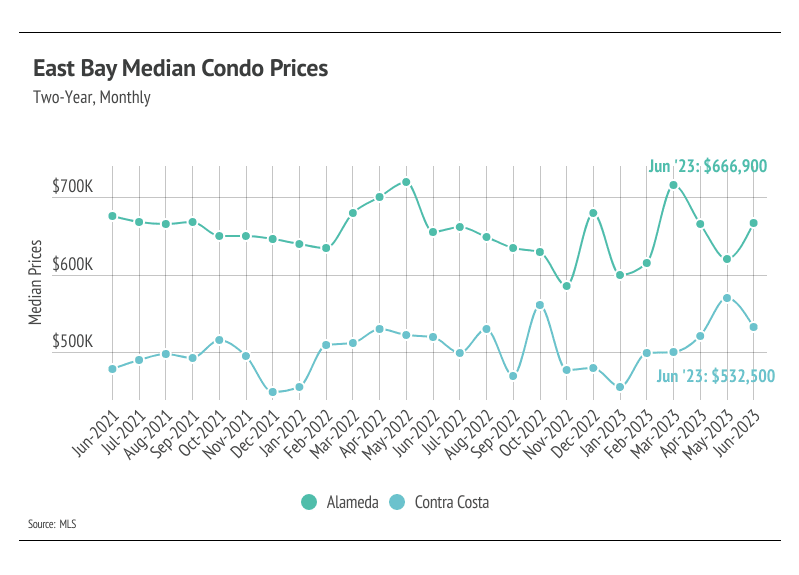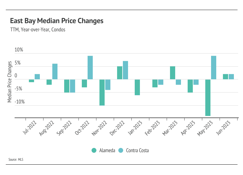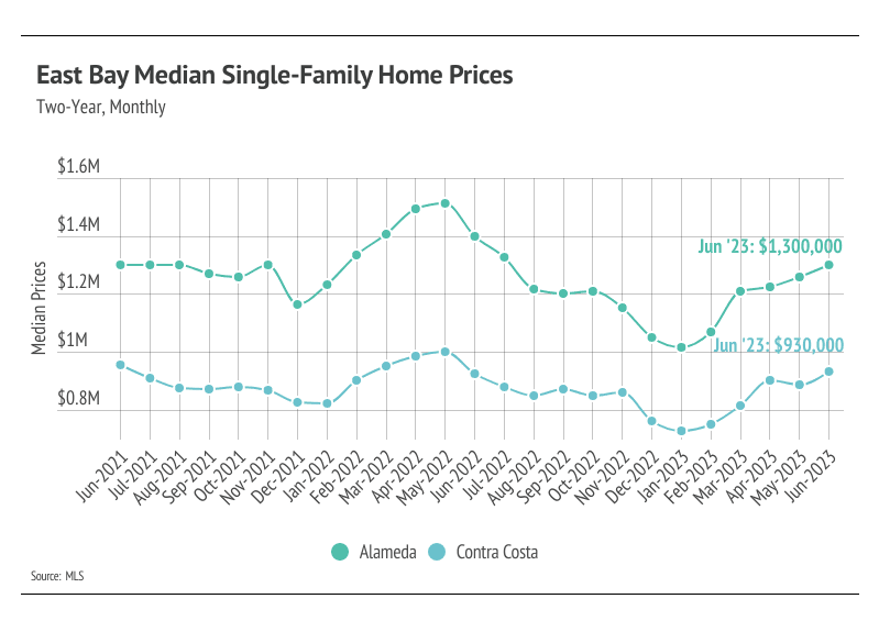Year to date, single-family home prices have increased 24% in Alameda and 22% in Contra Costa. Condo prices in Contra Costa are up 10% in the first half of 2023, while Alameda condo prices are down 3%.