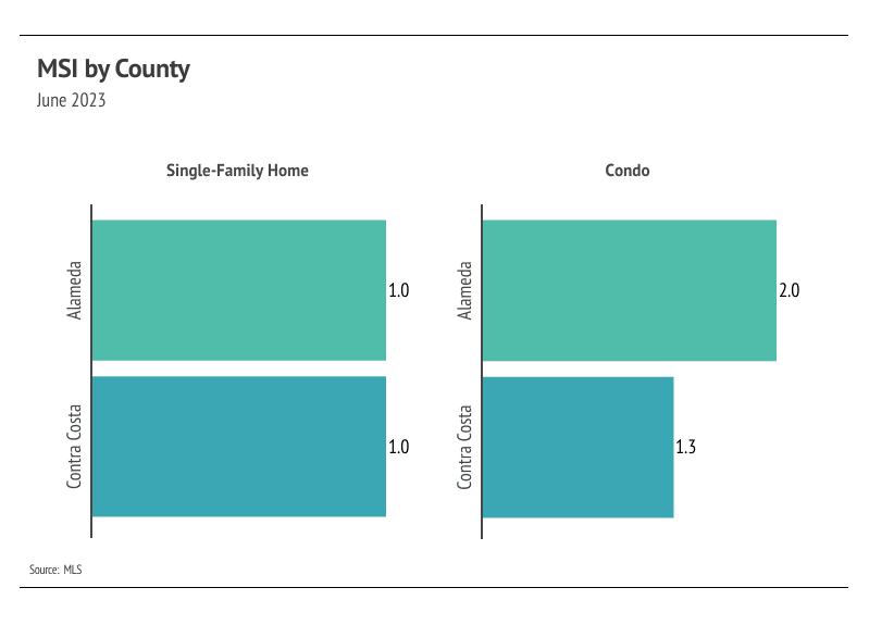 Months of Supply Inventory (MSI) quantifies the supply/demand relationship by measuring how many months it would take for all current homes listed on the market to sell at the current rate of sales. The long-term average MSI is around three months in California, which indicates a balanced market. An MSI lower than three indicates that there are more buyers than sellers on the market (meaning it’s a sellers’ market), while a higher MSI indicates there are more sellers than buyers (meaning it’s a buyers’ market). The East Bay market tends to favor sellers, which is reflected in its low MSI. MSI trended lower in the first half of the year for both single-family homes and condos, meaning the market more strongly favors sellers. The sharp drop in MSI occurred due to the higher proportion of sales relative to active listings and less time on the market.