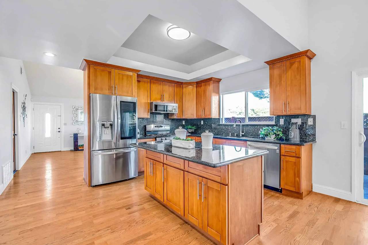 • Updated kitchen boasts granite countertop with full backsplash, island with wine cooler, ample of cabinets, 4-burner gas cooking range, microwave hood, stainless-steel appliances includes LG Smart refrigerator and dishwasher⁠