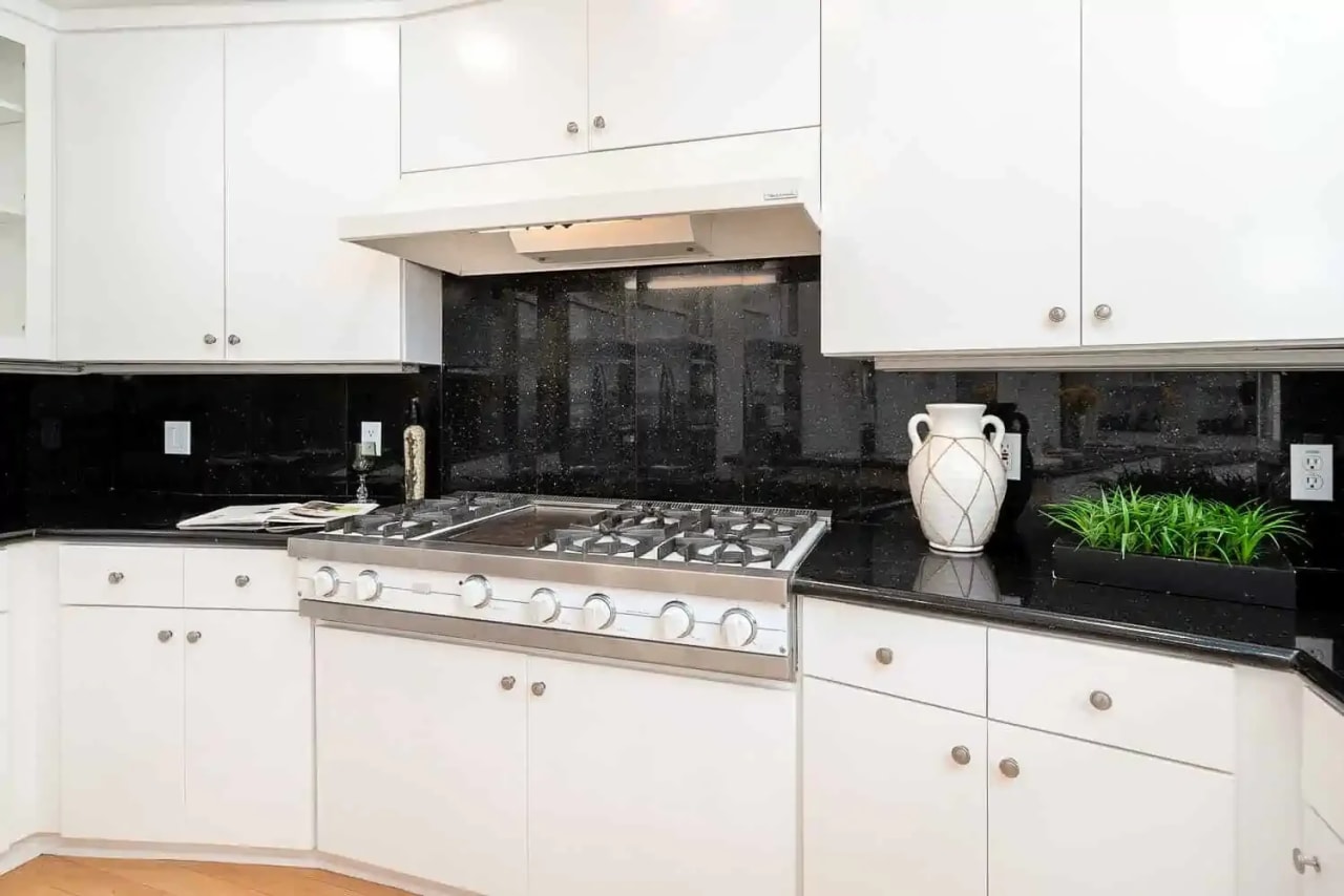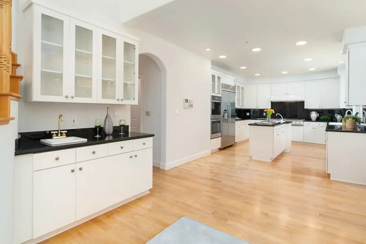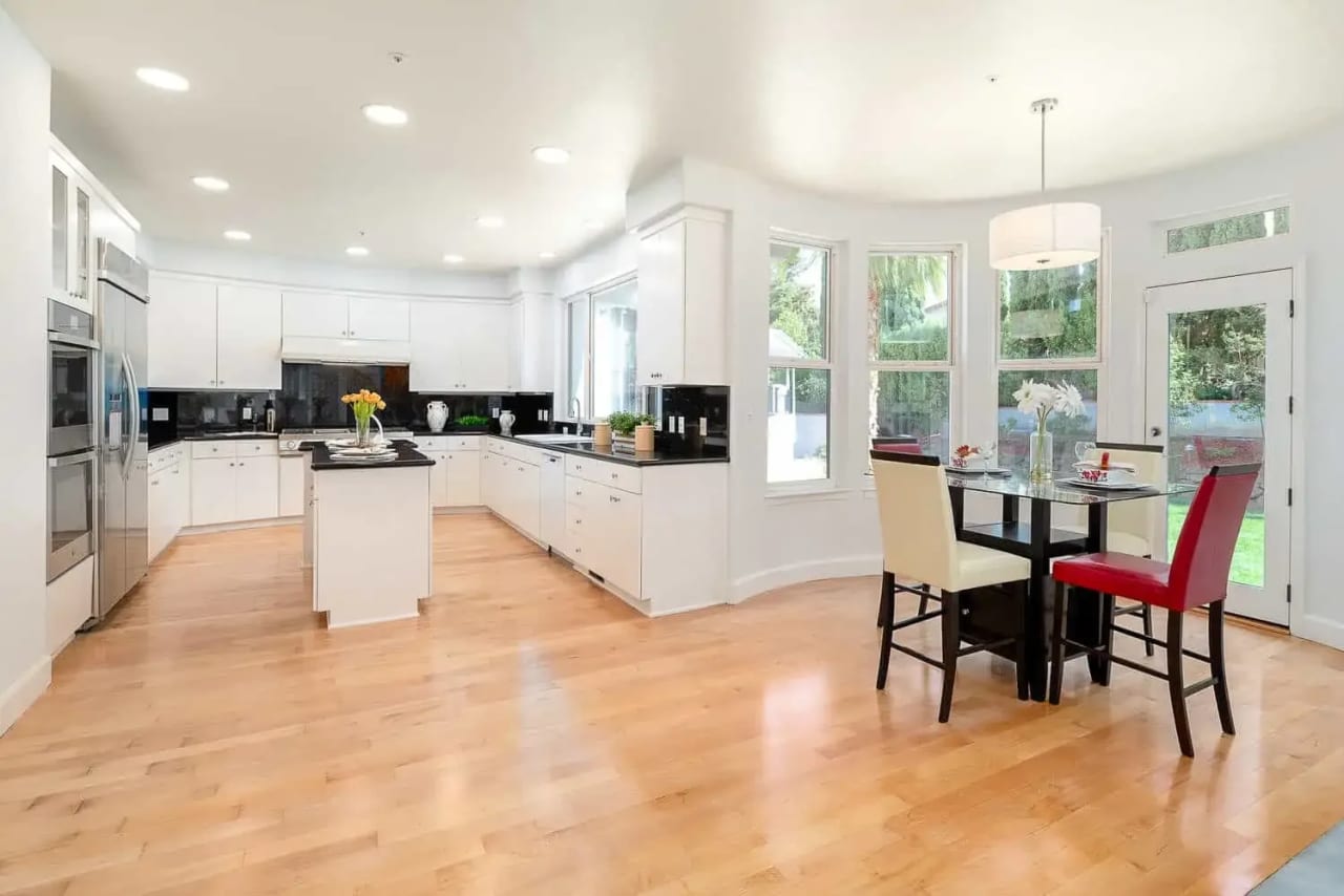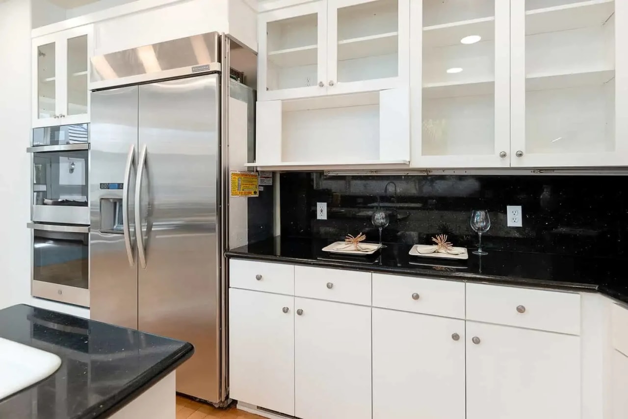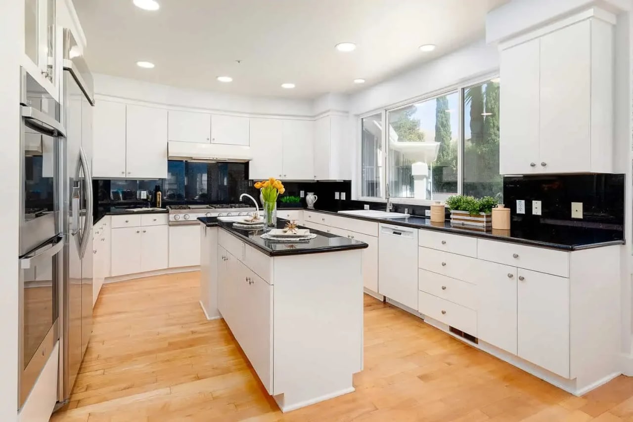 • Gourmet kitchen features granite countertop, full backsplash, viking 6-burner gas cooktop, built-in fridge, brand new double ovens, large island, bay window, and recessed lights