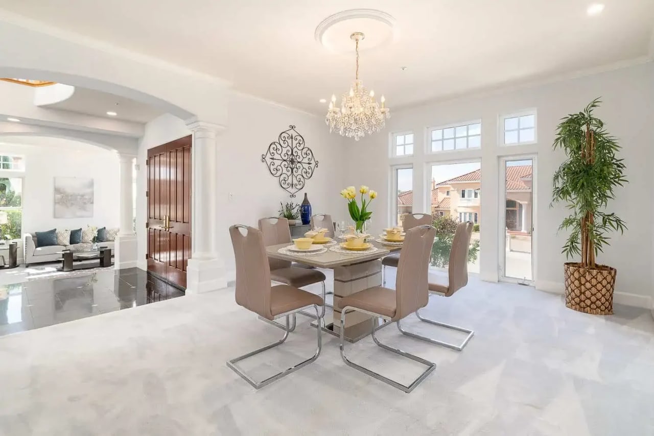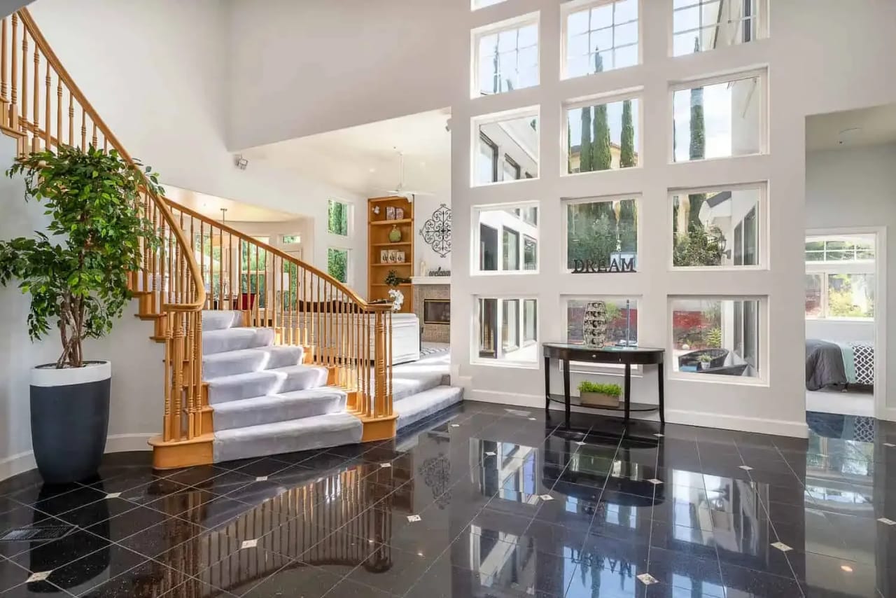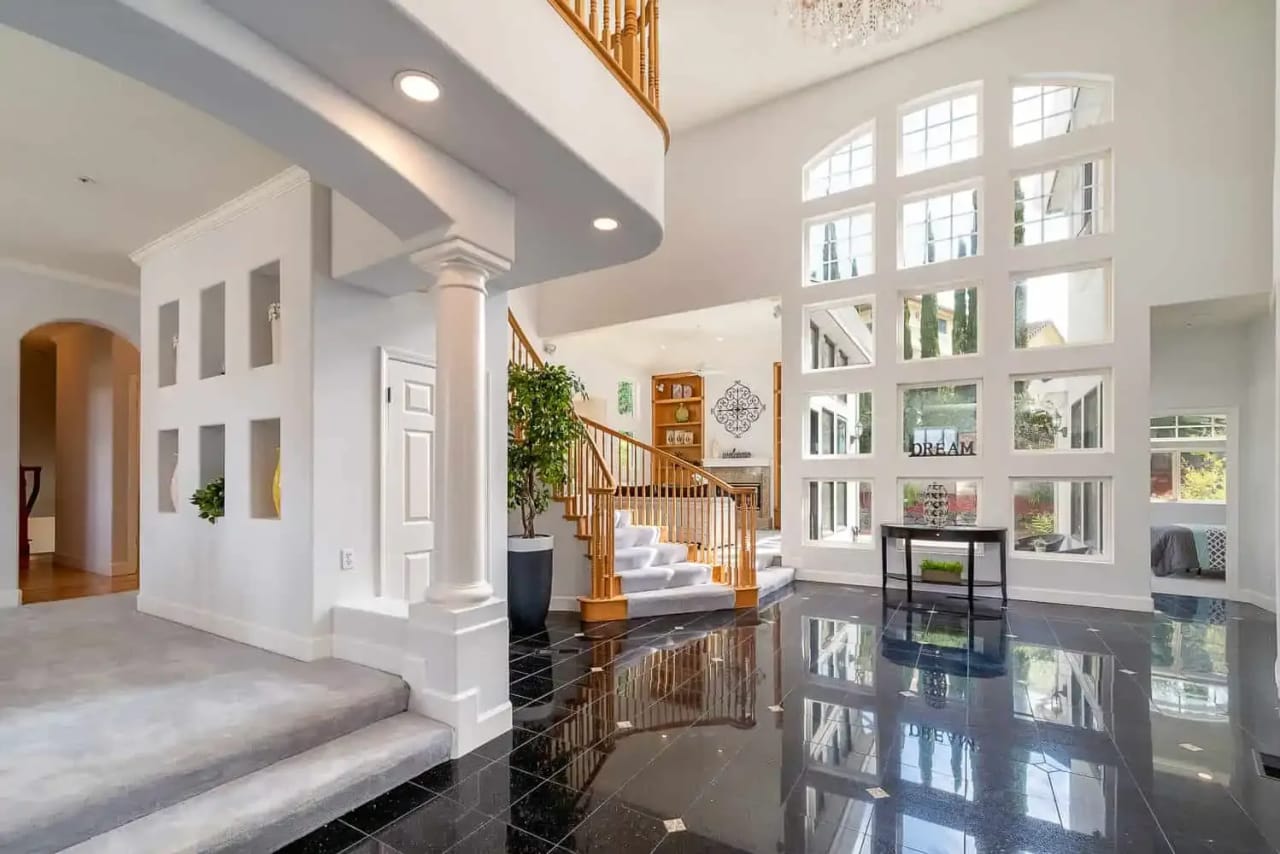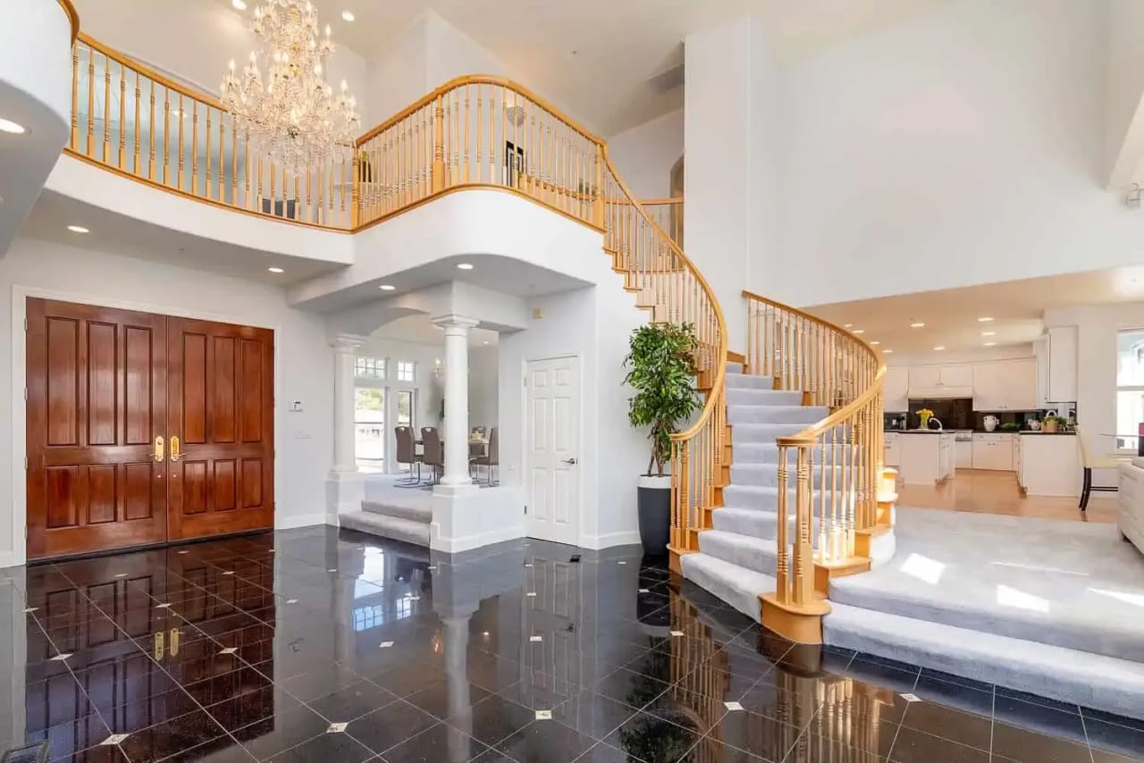 • Double-door entrance boasts a gorgeous marble floor with cathedral ceiling and elegant chandelier