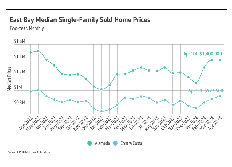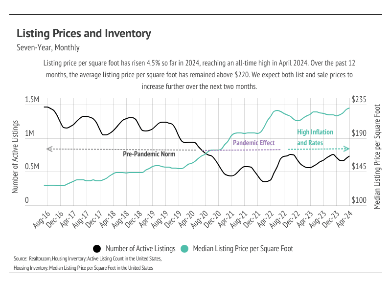 • Prices have already risen 6.8% over the past three months, landing only 2.2% below the all-time high reached in June 2022. Additionally, the median list price per square foot hit an all-time high in April 2024.