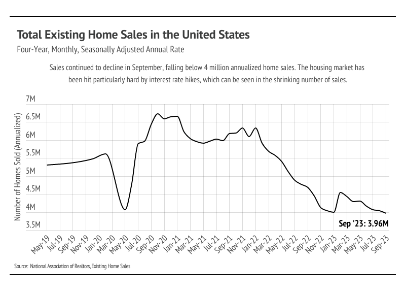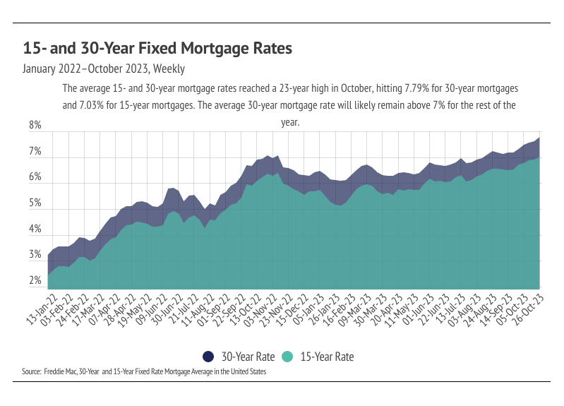 • In October, the average 30-year mortgage rate reached its highest level since October 2020 at 7.79%. Higher and higher rates continue to price potential buyers out of the market and prevent sellers who are locked into hyper-low rates from entering the market.