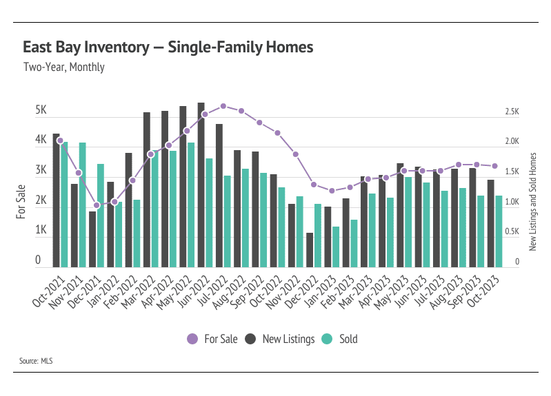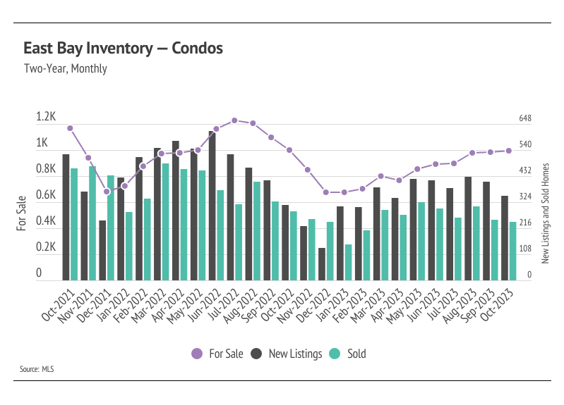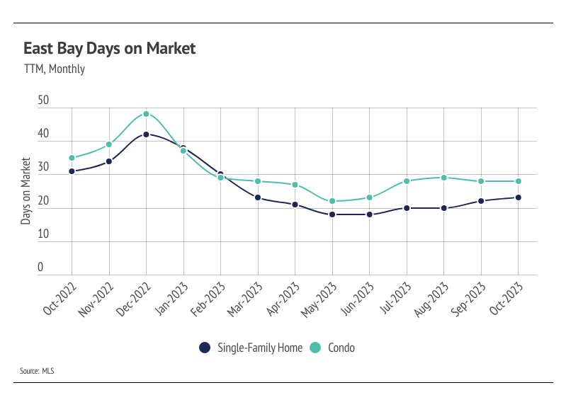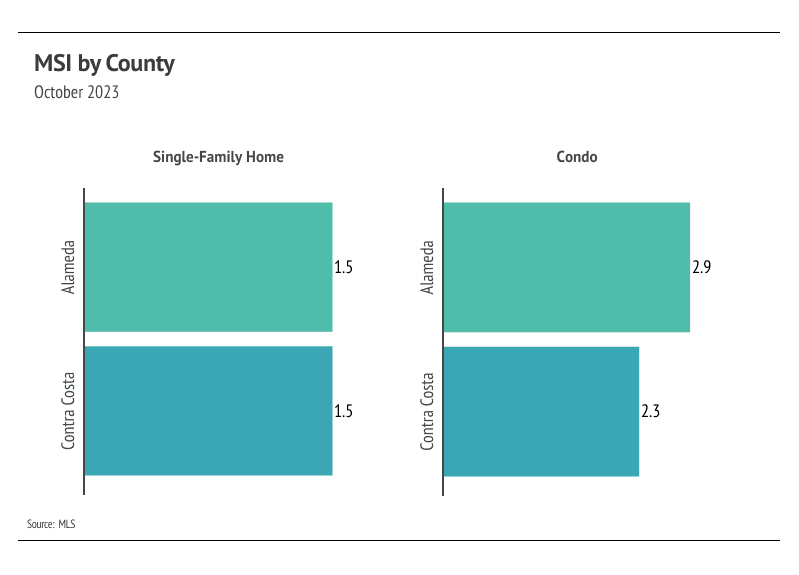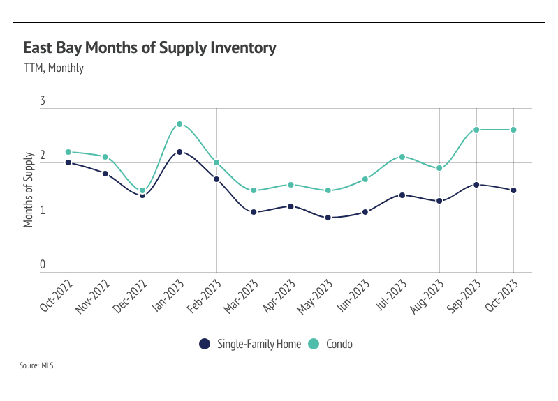 Months of Supply Inventory (MSI) quantifies the supply/demand relationship by measuring how many months it would take for all current homes listed on the market to sell at the current rate of sales. The long-term average MSI is around three months in California, which indicates a balanced market. An MSI lower than three indicates that there are more buyers than sellers on the market (meaning it’s a sellers’ market), while a higher MSI indicates there are more sellers than buyers (meaning it’s a buyers’ market). The East Bay market tends to favor sellers, which is reflected in its low MSI. MSI fell sharply in the first quarter this year before gently trending higher starting in May. In October, MSI remained below three months of supply, indicating the market still favors sellers.