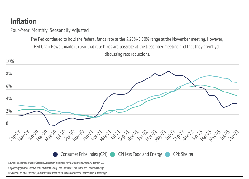 • The Q3 Real Gross Domestic Product (inflation-adjusted GDP) rose 4.9% quarter over quarter, indicating a broadly strong economy. Although unemployment rose 0.3% to 3.9%, the jobs market remains robust. Inflation, which rose in Q3, is nearly double the Fed’s target rate of 2%, so rate reductions won’t happen in the near future.