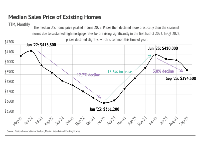 • The national median home price declined 3.8% in the third quarter, landing only 4.7% below the all-time high reached in June 2022 and reflecting typical seasonal trends. Prices didn’t contract significantly in Q3 2023 despite mortgage rates rising 0.6%.