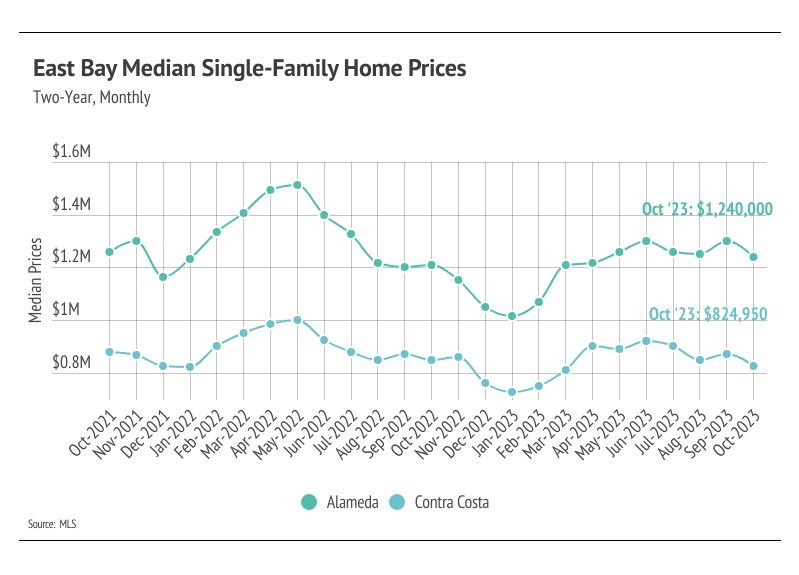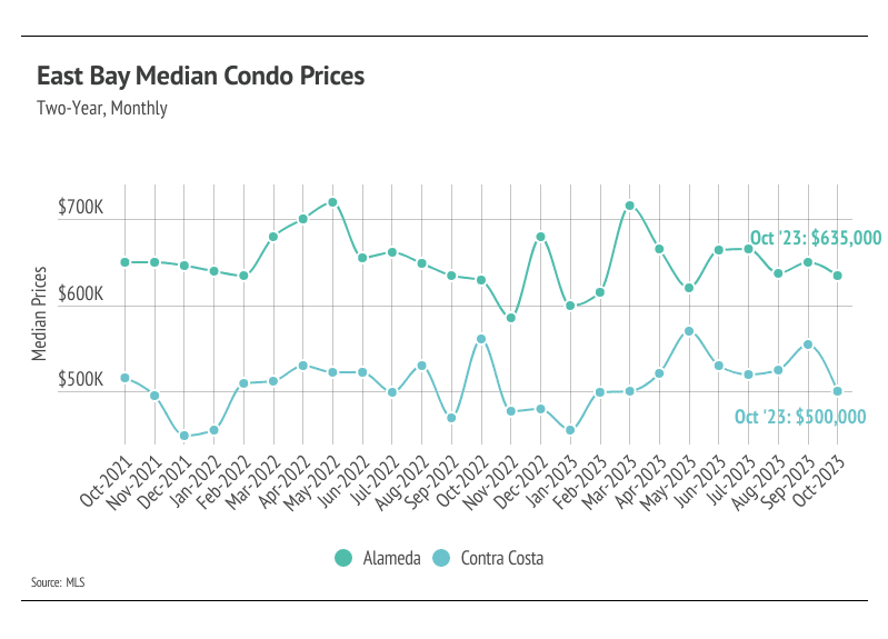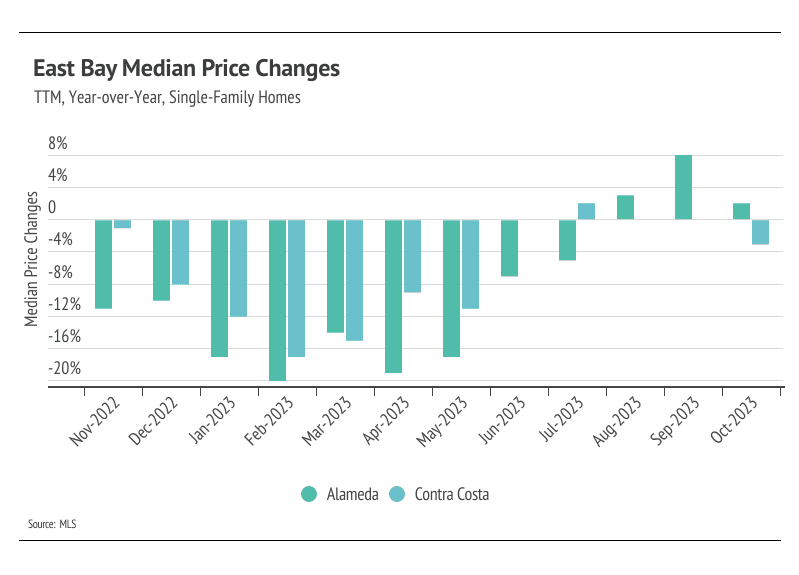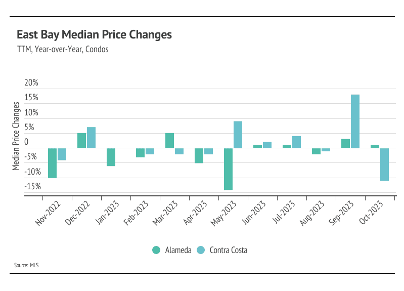 • The median single-family home and condo prices declined in the East Bay month over month. Year over year, prices in Alameda increased 2% for single-family homes and 1% for condos, while single-family home and condo prices in Contra Costa declined 3% and 11%, respectively.