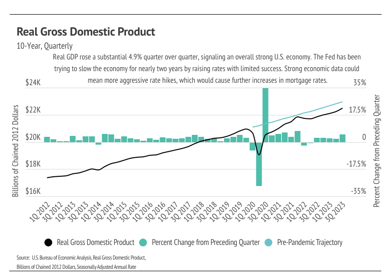High mortgage rates aren’t going away anytime soon because inflation is still about twice as high as the Fed would like. So far, most of the economic slowing the Fed intended by raising rates seems to be isolated to the housing market. The National Association of Realtors (NAR) reported that the number of homes sold dropped 2.0% month over month and 15.4% year over year to the lowest number of sales in the four years that NAR reports. Real GDP rose significantly in Q3 2023, indicating strong U.S. economic growth rather than economic slowdown. It’s unlikely that the Fed will hike rates at the December meeting, and very unlikely that they will reduce rates in the near future. We can expect mortgage rates between 7% and 8% in 2024, which will continue to slow the market.
