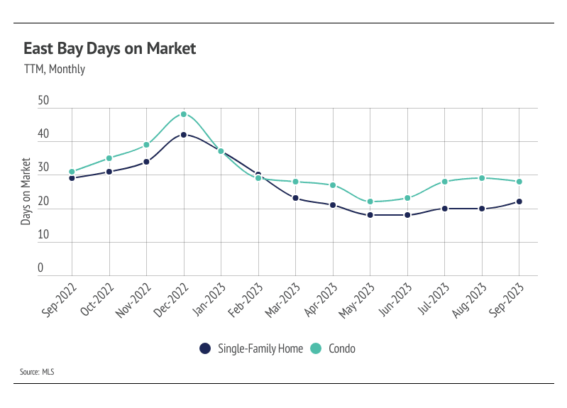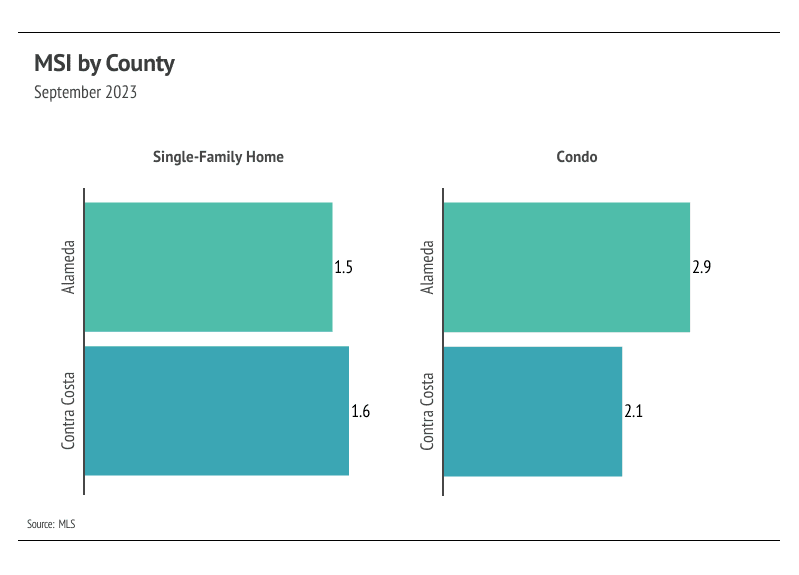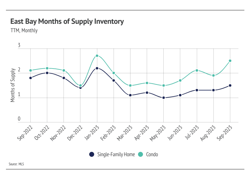 Months of Supply Inventory (MSI) quantifies the supply/demand relationship by measuring how many months it would take for all current homes listed on the market to sell at the current rate of sales. The long-term average MSI is around three months in California, which indicates a balanced market. An MSI lower than three indicates that there are more buyers than sellers on the market (meaning it’s a sellers’ market), while a higher MSI indicates there are more sellers than buyers (meaning it’s a buyers’ market). The East Bay market tends to favor sellers, which is reflected in its low MSI. MSI fell sharply in the first quarter this year before trending up in the second and third quarters. But just because MSI has been rising doesn’t mean MSI is high. MSI remained below three months of supply, indicating the market still favors sellers.