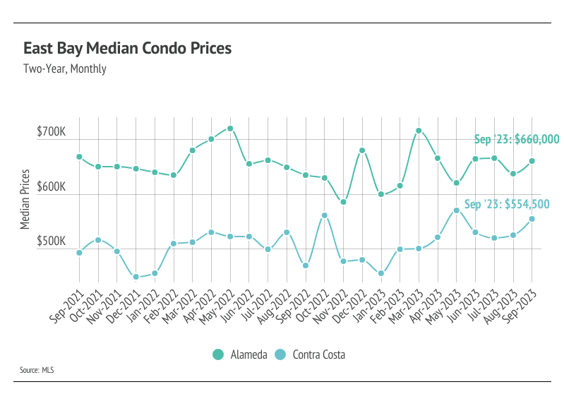 • Year over year, single-family home and condo prices were up across the East Bay. Contra Costa condo prices rose most significantly, up 18% since last September. We expect home prices to remain fairly stable in the fourth quarter.
